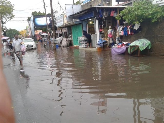 தற்போது தொடர்ச்சியாக பெய்து வரும் கடும் மழையால் யாழ் நகரம் வெள்ளக்காடாக மாறிவரு கின்றது. யாழ்ப்பாணம் பஸ் நிலை யத்திற்கு அருகிலுள்ள நடைபாதை கடைகள் மிகவும் பாதிக்கப்பட்டுள்ளன. கடைகளிற்குள் வெள்ளம் புகுந்தமையால் வியாபாரம் தடைப்பட்டதுடன் குறித்த பகுதியில் போக்குவரத்தும் முற்றாக தடைப்பட்டுள்ளது.