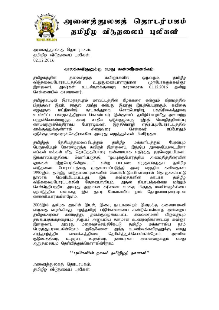 தமிழகத்தின் தலைசிறந்த கவிஞர்களில் ஒருவரும், தமிழீழவிடுதலைப் போராட்டத்தின் உறுதுணையாளருமான முற்போக்குக்கவிஞர் இன்குலாப் அவர்களின் மறைவிற்கு அனைத்துலகத் தொடர்பகம், தமிழீழ விடுதலைப் புலிகள் இரங்கல் தெரிவித்து அறிக்கை ஒன்றினை வெளியிட்டுள்ளனர்.