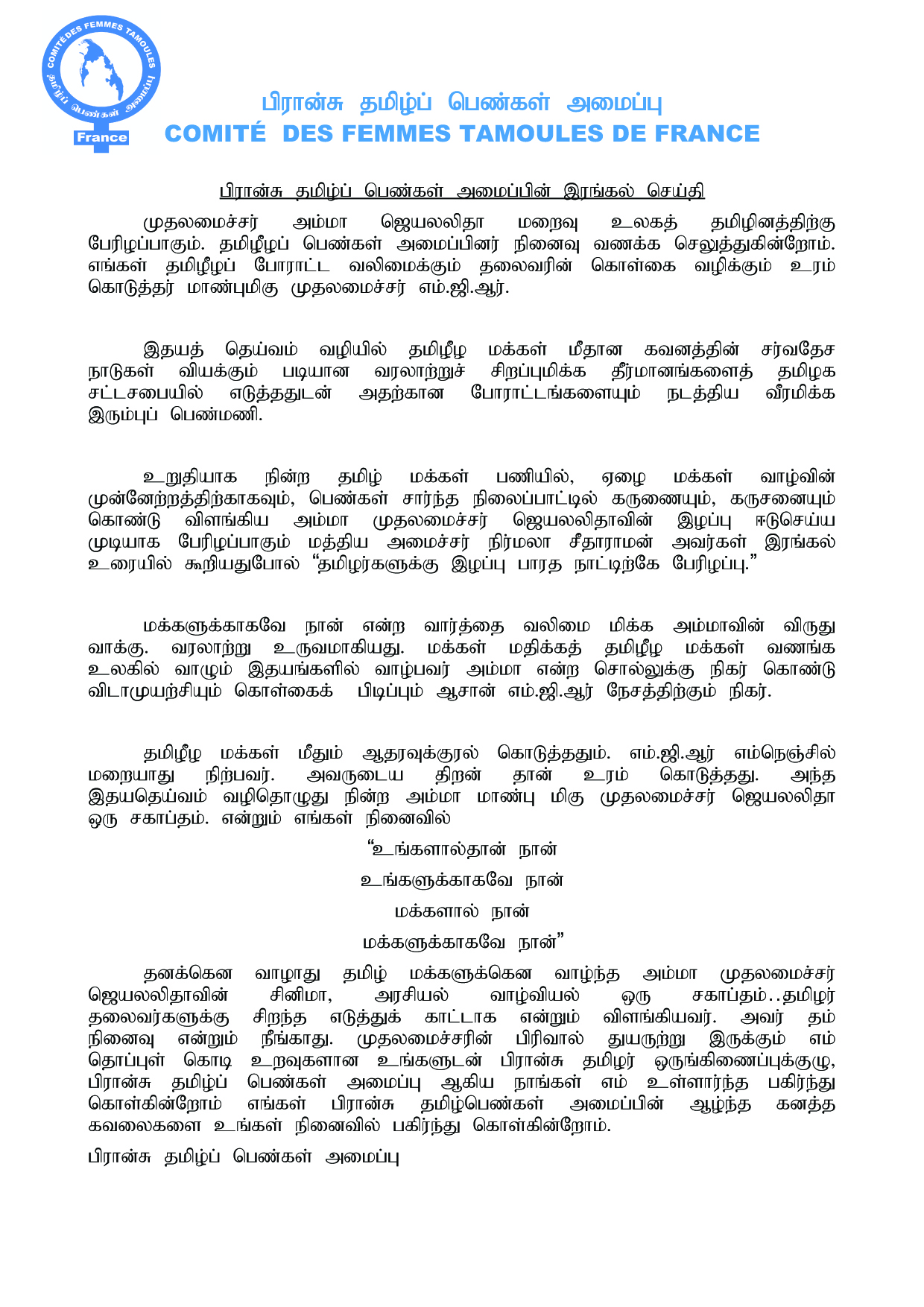 தனக்கென வாழாது தமிழ் மக்களுக்கென வாழ்ந்த அம்மா முதலமைச்சர் ஜெயலலிதாவின் சினிமா, அரசியல் வாழ்வியல் ஒரு சகாப்தம்…தமிழர் தலைவர்களுக்கு சிறந்த எடுத்துக்காட்டாக என்றும் விளங்கியவர். அவர் தம் நினைவு என்றும் நீங்காது. முதலமைச்சரின் பிரிவால் துயருற்று இருக்கும் எம் தொப்புள் கொடி உறவுகளான உங்களுடன் பிரான்சு தமிழர் ஒருங்கிணைப்புக்குழு, பிரான்சு தமிழ்ப் பெண்கள் அமைப்பு ஆகிய நாங்கள் எம் உள்ளார்ந்த கவலைகளை பகிர்ந்து கொள்கின்றோம். எங்கள் பிரான்சு தமிழ்பெண்கள் அமைப்பின் ஆழ்ந்த கனத்த கவலைகளை உங்கள் நினைவில் பகிர்ந்து கொள்கின்றோம்.