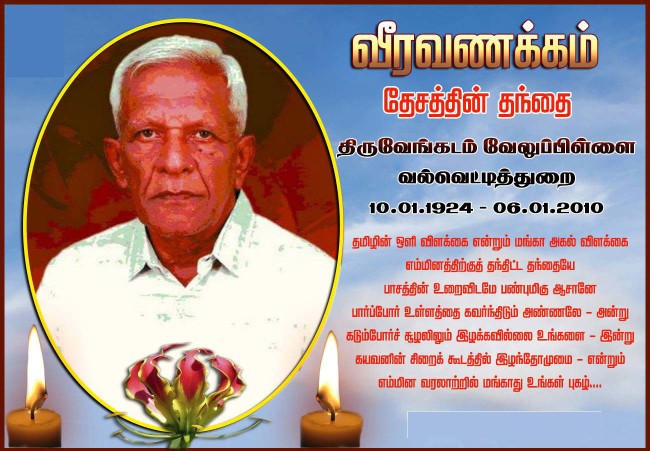 2010 ஆம் ஆண்டு தை மாதம் 6 ம் திகதி மாதந்தை திருவேங்கடம் வேலுப்பிள்ளை அவர்கள் தனது 86 வது வயதில் பனாகொடவில் இருக்கும் இராணுவ முகாமில் தனது இறுதி மூச்சை எம் மண்ணுக்காக விட்டுச்சென்றார்.ஈழத்தமிழர்களின் ஒரே தேசியத்தலைவர் மேதகு பிரபாகரன் வேலுப்பிள்ளை அவர்களை எம் தேசத்தின் விடிவுக்காய் தந்த எங்கள் மாதந்தை திருவேங்கடம் வேலுப்பிள்ளை அவர்களின் பிரிவு எம்மை மிக ஆழ்ந்த சோகத்தில் இட்டுசென்றது.