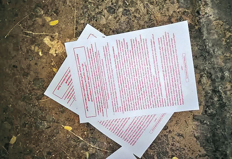 இது குறித்த துண்டுப் பிரசுரங்கள் கிளிநொச்சி நகரின் பல இடங்களிலும் நேற்று(06) இரவுவேளை இனந்தெரியாத நபர்களினால் வீசப்பட்டுள்ளதாக தெரிவிக்கப்பட்டுள்ளது. தமிழ் தேசியத்திற்கு எதிராக செயற்படும் அரசியல் தலைமைகளை எச்சரித்து இந்த துண்டுபிரசுரம் வீசப்பட்டுள்ளதாக தெரிவிக்கப்பட்டுள்ளது