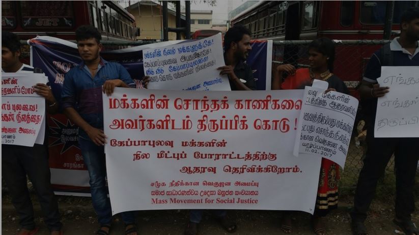 இன்றைய தினம் காலை 9.30 மணியளவில் சமூக நீதிக்கான வெகுஜன அமைப்பின் ஏற்பாட்டில் யாழ். பேரூந்து நிலையத்தில் ஒன்றுகூடிய பொதுமக்கள் கேப்பாப்புலவு மக்களுக்காக பதாகைகளை தாங்கி தமது ஆதரவை வெளிப்படுத்தினர்.