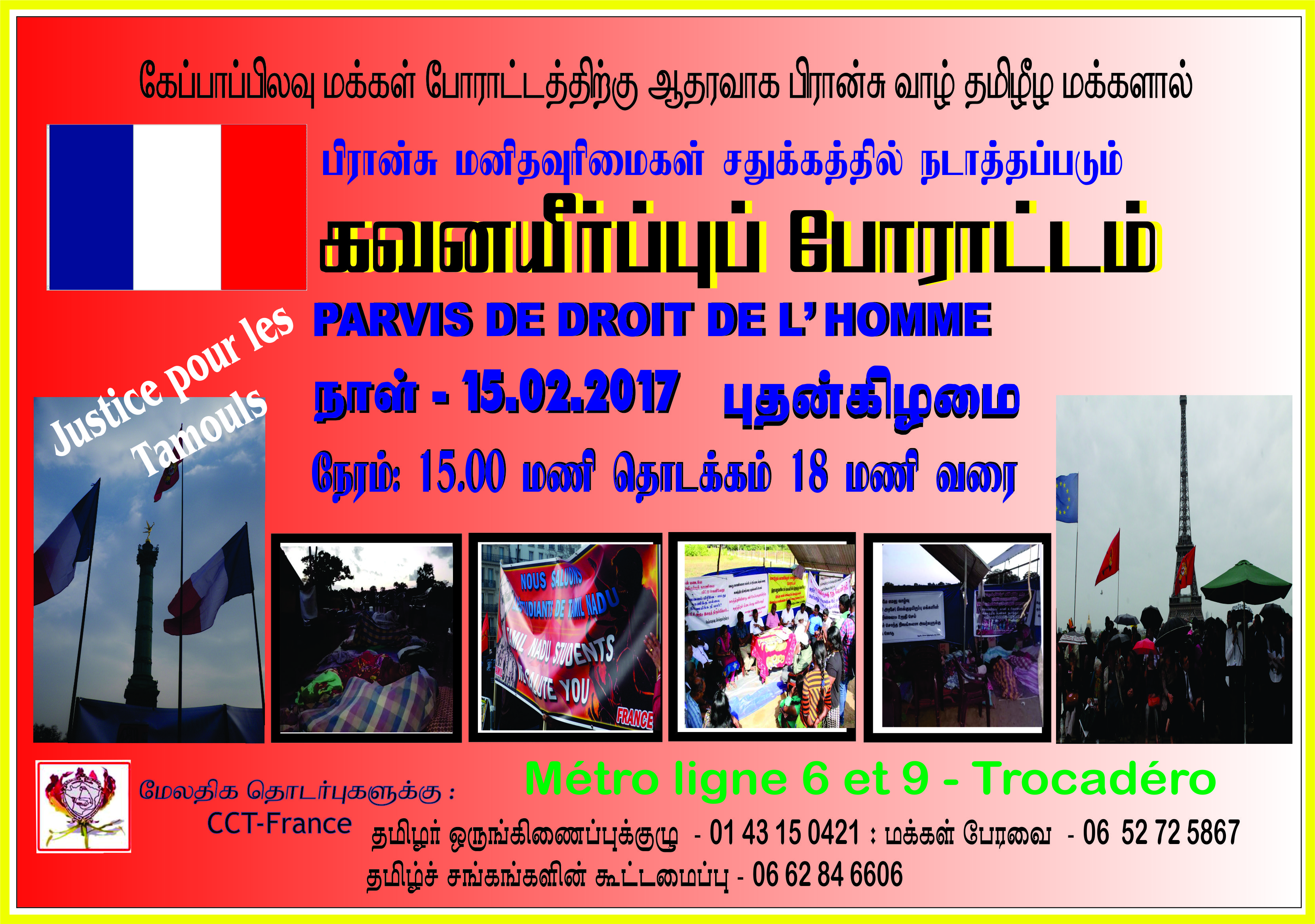 சிறீலங்காப் படைகளால் ஆக்கிரமிக்கப்பட்டிருக்கும் தமது நிலங்களை விடுவிக்க காலவரையின்றி காடந்த 31.01.2017 தொடக்கம் தொடர் போராட்டத்தை நடத்தி வரும் எம்முறவுகளுக்கு வலுச்சேர்க்கும் முகமாக பிரான்சு மனிதஉரிமைகள் சதுக்கம் முன்பாக எதிர்வரும் 15.02.2017 புதன்கிழமை பகல் 15.00 மணிதொடக்கம் 18.00 மணிவரை நடைபெற உள்ளது. இரவு பகல் பாராது போராடும் எமது மக்களின் போராட்டத்திற்கு வலுச் சேர்ப்போம்.