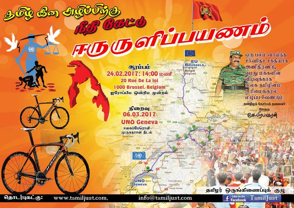 ஐநா நோக்கிய பேரணியை வலுப்படுத்தவும் , ஐரோப்பிய நாடுகளிடம் நீதிகோரியும் ஐரோப்பிய ஒன்றிய முன்றலில் இருந்து ஐநா நோக்கிய மனிதநேய ஈருருளிப் பயணம் எதிர்வரும் 24.2.2017 அன்று பகல் 14.00 மணிக்கு ஆரம்பிக்க இருகின்றது . மனிதநேய ஈருருளிப்பயணம் பெல்ஜியம் , லக்சம்புர்க், யேர்மனி,பிரான்ஸ் ஊடாக 06.03.2017 அன்று சுவிஸ், ஜெனிவா சர்வதேச முச்சந்தியில் முருகதாசன் திடலில் சென்றடைய உள்ளது .