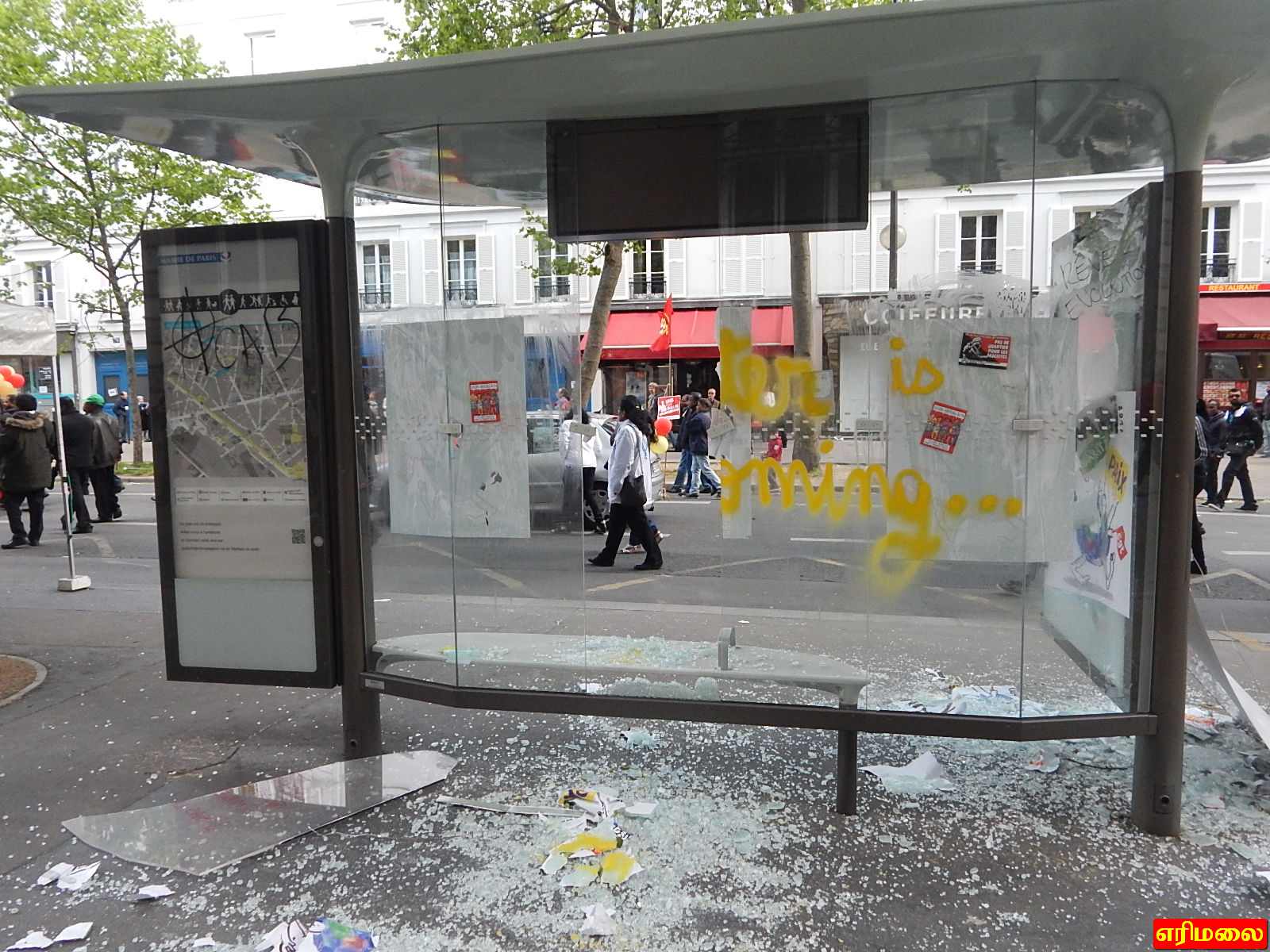 வீதியில் காணப்பட்ட பேருந்து தரிப்பிடங்கள் விளம்பர சுவர்கள் அனைத்தும் ஆர்ப்பாட்டக்காரர்களால் அடித்து நொருக்கப்பட்டன.வேறு வழியின்றி காவல்துறையினர் கண்ணீர் புகை வீசி பதில் தாக்குதல் நடத்தி ஆர்ப்பாட்டக்காரர்களை கலைந்து போக செய்தனர்.
