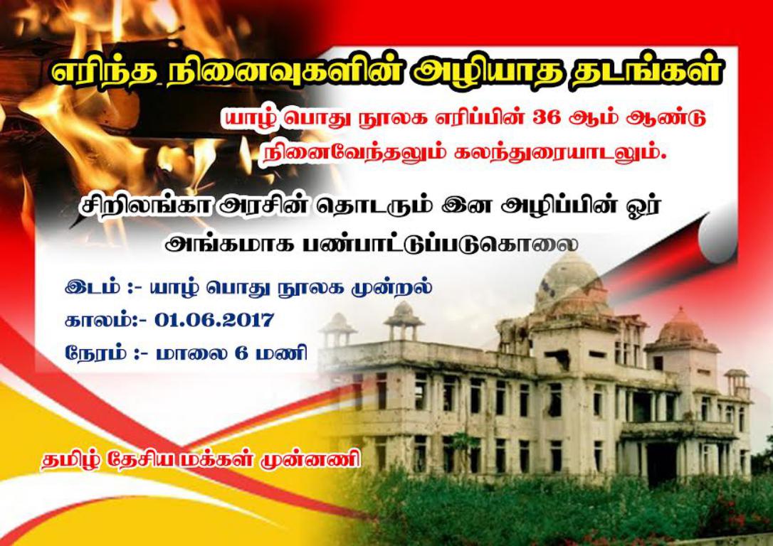 ஈழச்செய்திகள் எரிந்த நினைவுகளில் அழியாத தடங்கள் By Admin - June 1, 2017 0 410 சிறீலங்கா அரசின் அமைச்சர் ஒருவர் முன்னின்று 31.05.1981 அன்று எரித்த தமிழரின் வரலாற்று களஞ்சியம் யாழ் நூலக எரிப்பின் 36 ஆம் ஆண்டு நினைவேந்தலும் கலந்துரையாடலும் இன்று மாலை 18.00 மணிக்கு யாழ் பொது நூலக முன்றலில் இடம் பெற உள்ளது.