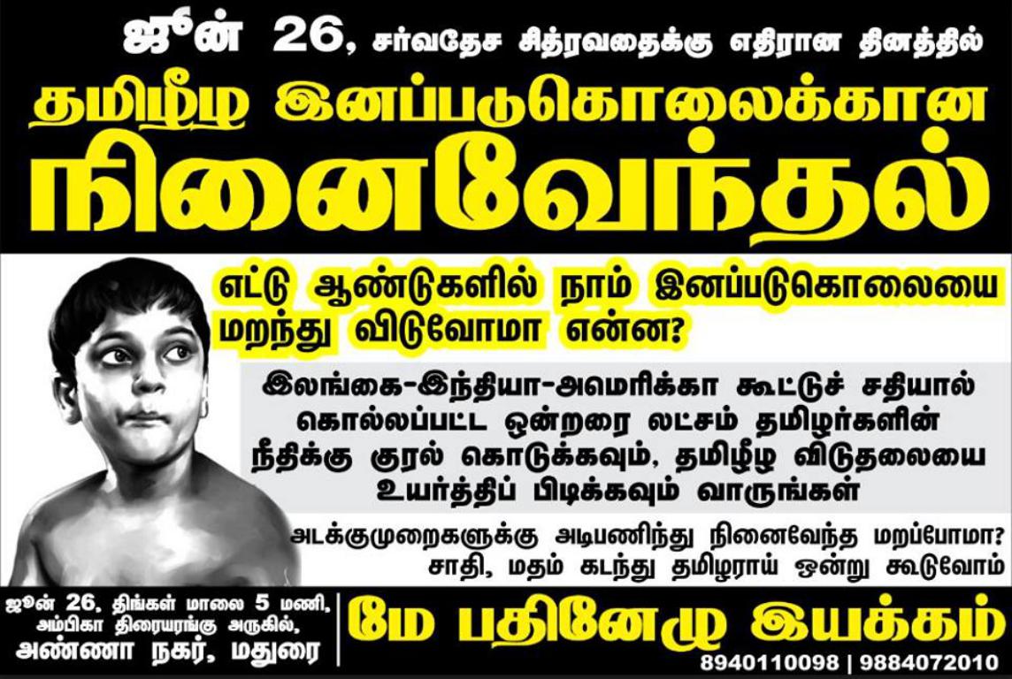 ஆயிரம் ஆண்டுகள் கடந்தாலும் இனப்படுகொலையை மறக்க மாட்டோம். இலங்கை-இந்தியா-அமெரிக்கா கூட்டுச் சதியினால் படுகொலை செய்யப்பட்ட ஒன்றரை லட்சம் தமிழர்களின் நீதிக்கு குரல் கொடுக்க ஒன்று கூடுவோம்.