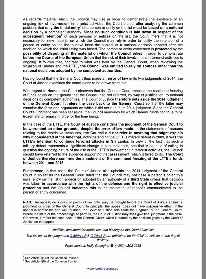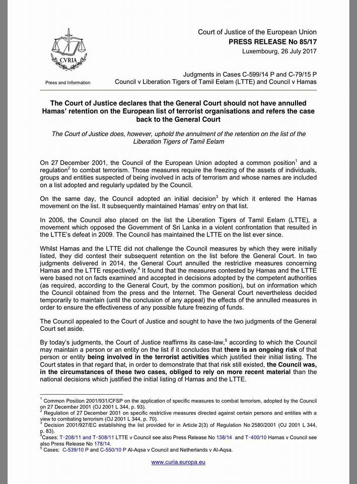 2009க்கு பிறகு எந்த வன்முறை செயலிலும் ஈடுபடாததால் தடை நீக்கப்படுவதாகவும், இந்த அமைப்புக்கு தாக்குதல் நடத்தும் திறன் இருப்பதற்கான எந்த ஆதாரமும் அளிக்கவில்லை எனக்கூறி தடையை நீக்கி ஐரோப்பிய யூனியன் நீதிமன்றம் உத்தரவிட்டுள்ளது.
