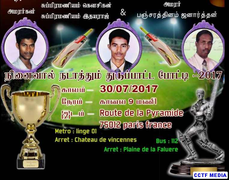 பிரான்சு தமிழர் ஒருங்கிணைப்புக்குழு தமிழர் விளையாட்டுத்துறையின் ஆதரவில் அரியாலை ஐக்கியகழகம் அமரர்கள் சுப்பிரமணியம் கௌசிகன், சுப்பிரமணியம் இதயராஜ், பஞ்சரத்தினம் ஜனார்த்தனன் ஆகியோரின் நினைவாக 5 ஆவது தடவையாக நடாத்திய துடுப்பெடுத்தாட்டப்போட்டி கடந்த 30.07.2017 ஞாயிற்றுக்கிழமை Chateau de vincennes பகுதியில் விறுவிறுப்பாக இடம்பெற்றது.