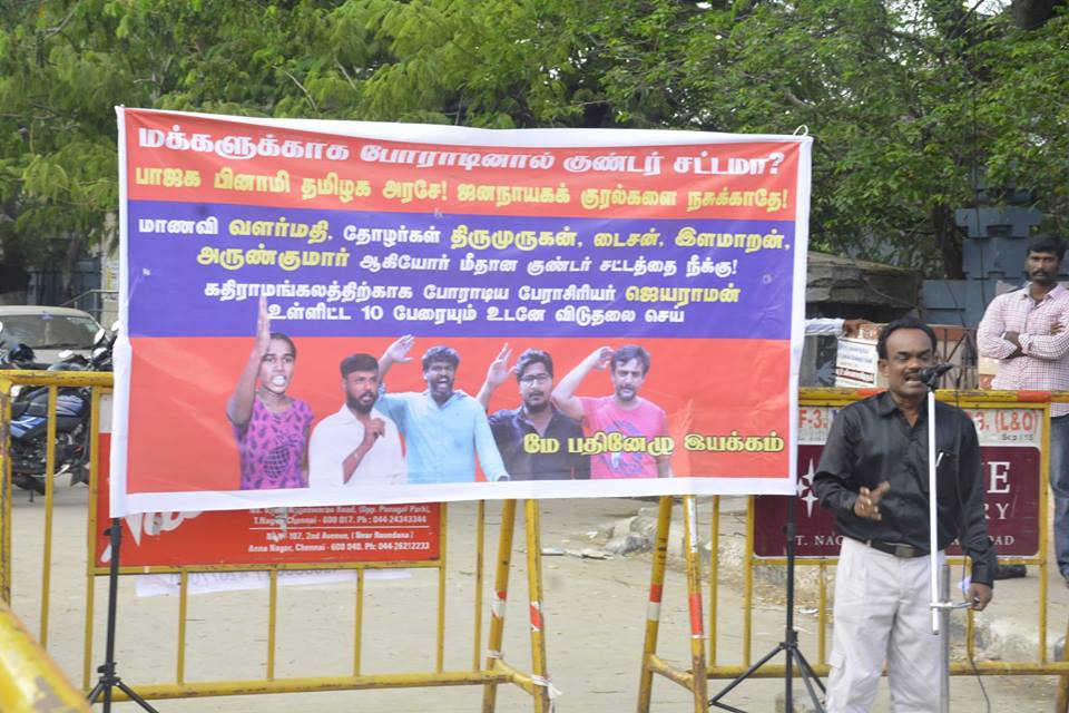 மாணவி வளர்மதி, தோழர்கள் திருமுருகன் காந்தி, டைசன், இளமாறன், அருண்குமார் ஆகியோர் மீதான குண்டர் சட்டத்தினை ரத்து செய்ய வலியுறுத்தியும், கதிராமங்கலத்தில் போராடிய பேராசிரியர் ஜெயராமன் உள்ளிட்ட 10 தோழர்களையும் விடுதலை செய்ய வலியுறுத்தியும் கண்டன ஆர்ப்பாட்டம் மே பதினேழு இயக்கம் சார்பில் 30-7-2017 ஞாயிறு அன்று வள்ளுவர் கோட்டத்தில் நடத்தப்பட்டது.