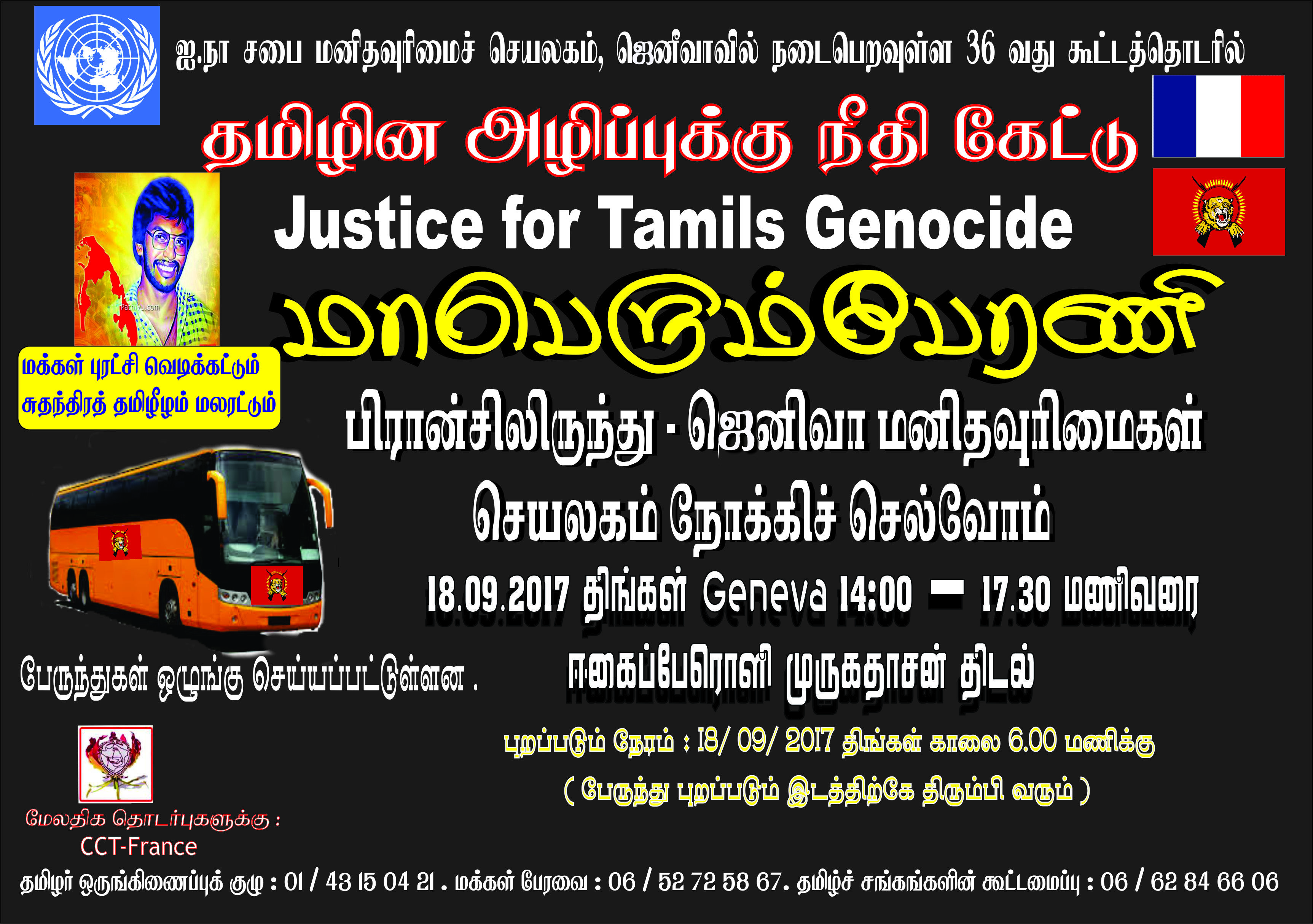 தமிழின அழிப்புக்கு நீதி கேட்டு இடம்பெறும் மாபெரும் பேரணியில் கலந்துகொள்வதற்கு எதிர்வரும் (18.09.2017) திங்கட்கிழமை பிரான்சிலிருந்து ஜெனிவா செல்வதற்கான பேருந்து ஒழுங்குகள் செய்யப்பட்டுள்ளன. உங்கள் பதிவுகளை முன்கூட்டியே செய்துகொள்ளுமாறு ஏற்பாட்டாளர்கள் கேட்டுள்ளனர்.