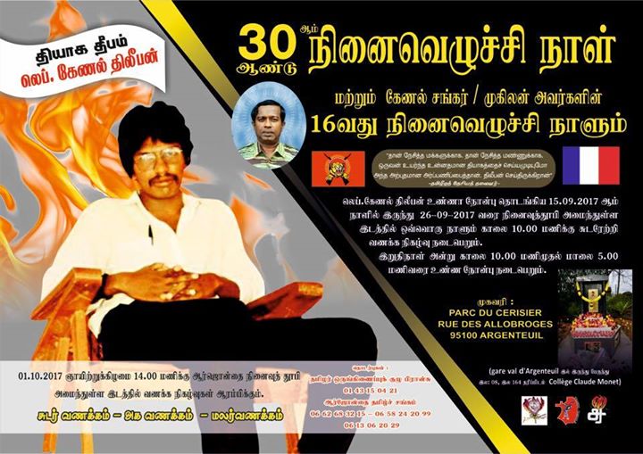 இந்திய ஆக்கிரமிப்பு படைகளுக்கு எதிராக நீர் ஆகாரமின்றி பன்னிருநாட்கள் உண்ணாநோன்பிருந்து உயிர் நீத்த தியாக தீபம் லெப்.கேணல் திலீபனின் 30 ஆம் ஆண்டு நினைவெழுச்சி நிகழ்வின் ஆரம்பமாக நிகழ்வாக பரிசின் புறநாகர் பகுதியான ஆர்ஜன்தை பகுதியில் தியாகதீபம் திலீபனின் நினைவு தூபி அமைந்துள்ள இடத்தில் இன்று (15.09.2017)காலை 10.00 மணிக்கு வணக்க நிகழ்வு இடம் பெற்றது.