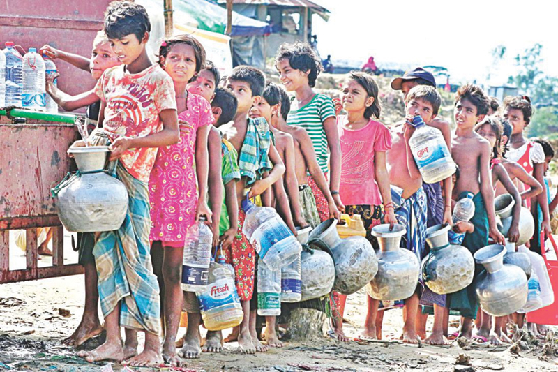 சுட்டெரிக்கும் வெயிலில் உணவுக்காக மணிக்கணக்கில் அகதிகள் காத்திருக்க வேண்டியுள்ளது. 500,000 பேருக்கும் போதிய உணவு வழங்க அறநிறுவனங்கள் சிரமப்பட்டு வருகின்றன. பங்களாதேஷில் உள்ள அகதி முகாம்களுக்குப் புதிதாக வருவோரில் பெரும்பாலானவர்கள் குழந்தைகளாவர்.