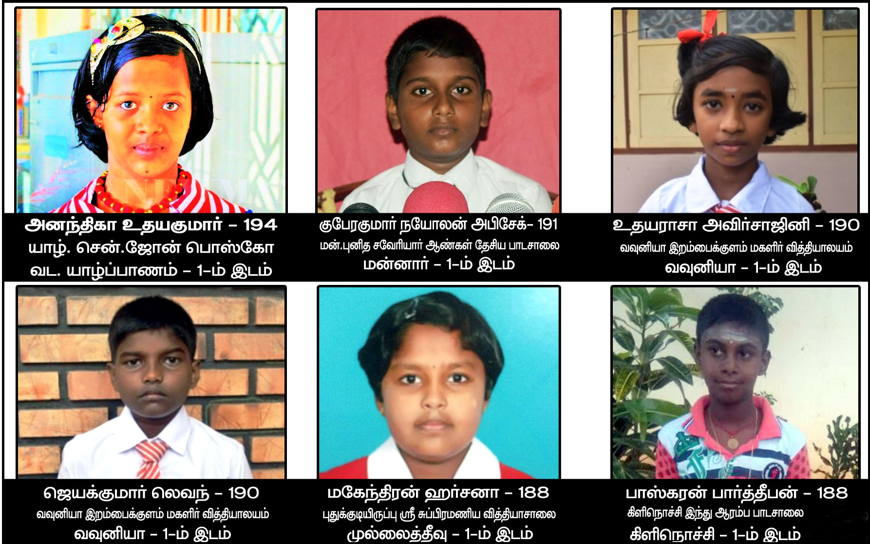முல் லைத்தீவில் புதுக்குடியிருப்பு ஸ்ரீ சுப்ரமணிய வித்தியாசாலை மாணவியான மகேந்திரன் ஹர்சனா 188 புள்ளிகளை பெற்று முதலிடம் பெற்றுள்ளார். கிளிநொச்சியில் கிளிநொச்சி இந்து ஆரம்ப பாடசாலை மாணவன் பாஸ் கரன் பார்த்தீபன் 188 புள்ளிகளை பெற்று முதலிடத்தை பெற்றுள்ளார்.