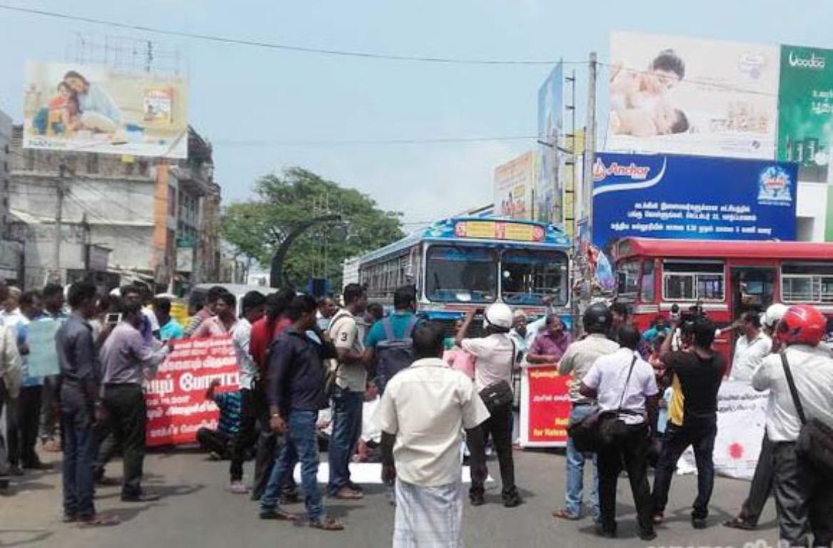 பிரதான பேருந்து நிலையத்திற்கு முன்பாக ஆரம்பமாகிய இவ்வார்ப்பாட்ட பேரணியில் ஈடுபட்டோர், திடீரென வீதி மறியலிலும் ஈடுபட்டனர்.