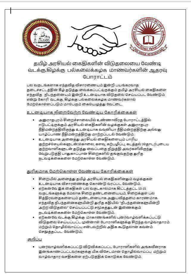 ஈழச்செய்திகள்சிறப்பு செய்திகள் தமிழ் அரசியல் கைதிகளின் விடுதலையை வலியுறுத்தி பல்கலை சமூகம் போராட்டம் ! By Admin - October 23, 2017 0 257