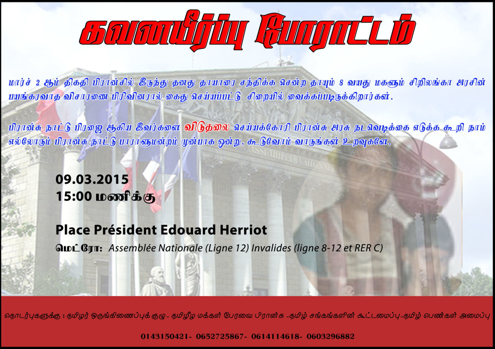 இவர்களின் விடுதலை தொடர்பாக விரைந்து நடவடிக்கை எடுக்க வலியுறுத்து முகமாக பிரான்சு நாடாளுமன்றமுன்றலில் கவனயீர்ப்பு ஒன்றுகூடல் ஒன்றையும் எதிர்வரும் திங்கள் கிழமை 09-03-2015 அன்று மாலை 3மணிக்கு ஒழுங்கு செய்யப்பட்டுள்ளது. இதில் அதிகளவில் மக்கள் பங்கேற்க வேண்டும் என்று அன்பாக வேண்டி நிற்கின்றோம்.