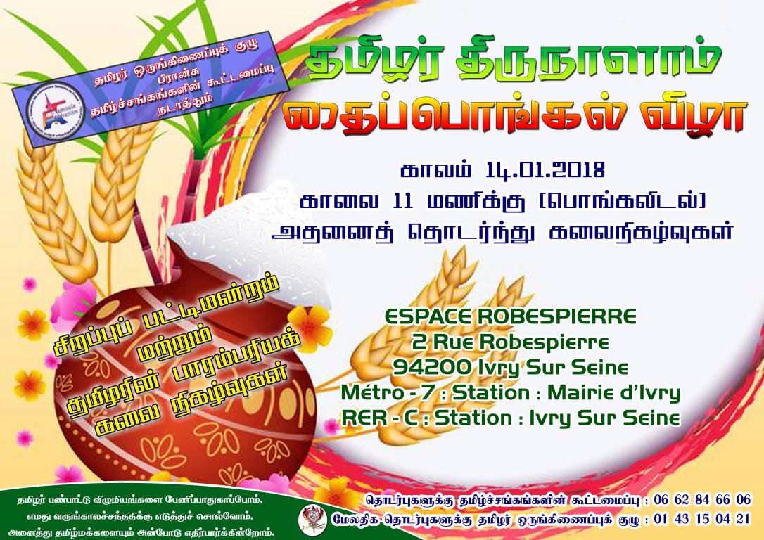 தமிழர் ஒருங்கிணைப்புக் குழு பிரான்சு, தமிழ்ச் சங்கங்களின் கூட்டமைப்பு நடாத்தும் தமிழர் திருநாளாம் தைப்பொங்கல் விழா, தமிழர் திருநாள் தை முதலாம் நாள் 14.01.2017 ஞாயிற்றுக்கிழமை அன்று காலை பொங்கலிடல் இடம் பெற்று தொடர்ந்து தமிழரின் பாரம்பரியக் கலைநிகழ்வுகளும் இவிரியில் இடம் பெற உள்ளன.