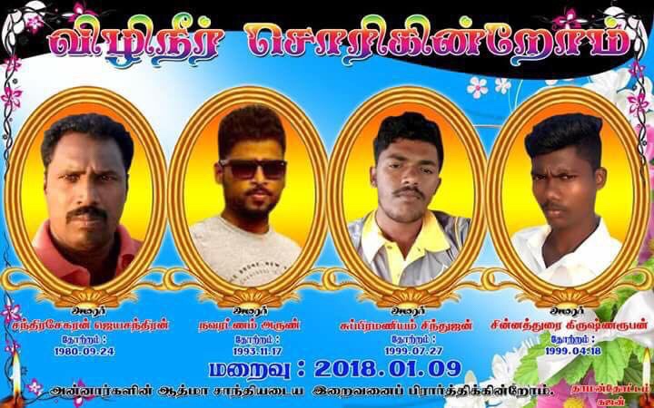 குறித்த சம்பவத்தில்,யாழ். அல்வாய் வடக்கு பகுதியைச் சேர்ந்த நவரத்தினம் அருண் (வயது 24), சந்திரசேகரம் ஜெயசந்திரன் (வயது 36), யாழ்.மாலு சந்தி பகுதியை சேர்ந்த சிவசுப்பிரமணியம் சிந்துஜன் (வயது 19) யாழ். பருத்திதுறையை சேர்ந்த சின்னத்துரை கிருஸ்ணரூபன் (வயது 19) ஆகியோரே உயிரிழந்துள்ளனர்.