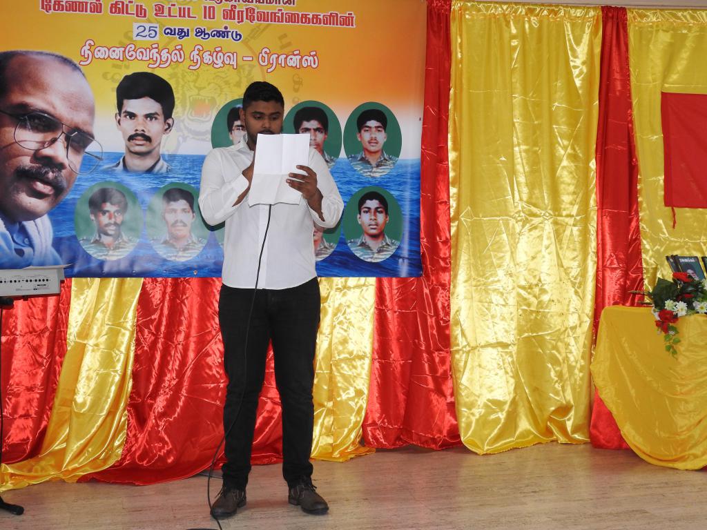 தமிழ் இளையோர்சார்பில் திரு. நிந்துலன் உரையாற்றும் போது, தாம் கேணல் கிட்டு அவர்கள் வாழ்ந்த காலத்தில் வாழவில்லை என்ற ஏக்கம் தனக்கு இருப்பதாகவும், அவர் குறித்த தரவுகளை இணையத்தின் ஊடாக பெற்ற போது அவரது ஆழுமையையும், அவரது தேடுதல்களையும் அறிந்து கொண்டதாகவும், தமிழீழம் என்ற இலட்சித்திற்காக இளைஞர்கள் அனைவரும் பாடுபட வேண்டும் என்றும், நாம் போராடாவிட்டால் எமது இனம் அழிந்து விடும் என்றும், கேணல் கிட்டுவின் உயிர் தியாகம் அவரின் மனவலிமையை காட்டுவதாகவும், கிட்டுமாம தான் வாழ்ந்த காலத்தில் தன்னால் இயன்ற பங்களிப்பைச் செய்துள்ளார் அதேபோல் இளையோர் அனைவரும் போராட்டப்பாதைக்கு ஒன்றிணைந்து வலுச் சேர்ப்போம் என்றும் தெரிவித்தார்.