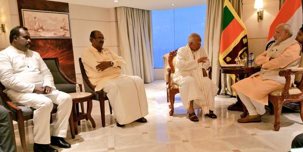 இலங்கைக்கு இரண்டு நாள் உத்தியோக பூர்வ விஜயம் மேற்கொண்டு வருகைதந்துள்ள இந்தியப் பிரதமர் நரேந்திர மோடி நேற்று மாலை 6மணிக்கு கொழும்பு தாஜ்சமுத்திர ஹோட்டலில் தமிழ்த் தேசியக் கூட்டமைப்பைச் சந்தித்திருந்தார். சுமார் அரைமணி நேரம் நீடித்திருந்த இச்சந்திப்பில் தமிழ்த் தேசியக் கூட்டமைப்பின் தலைவர் இரா.சம்பந்தன் தலைமையில் கூட்டமைப்பின் ஊடகப்பேச்சாளரும் பாராளுமன்ற உறுப்பினருமான சுரேஸ்பிரேமச்சந்திரன், தமிழரசுக்கட்சித் தலைவரும் பாராளுமன்ற உறுப்பினருமான மாவை.சேனாதிராஜா, ரெலோ அமைப்பின் தலைவரும் பாராளுமன்ற உறுப்பினருமான செல்வம் அடைக்கலநாதன் மற்றும் பாராளுமன்ற உறுப்பினர் எம்.ஏ.சுமந்திரன் ஆகியோர் கலந்து கொண்டிருந்தனர்.