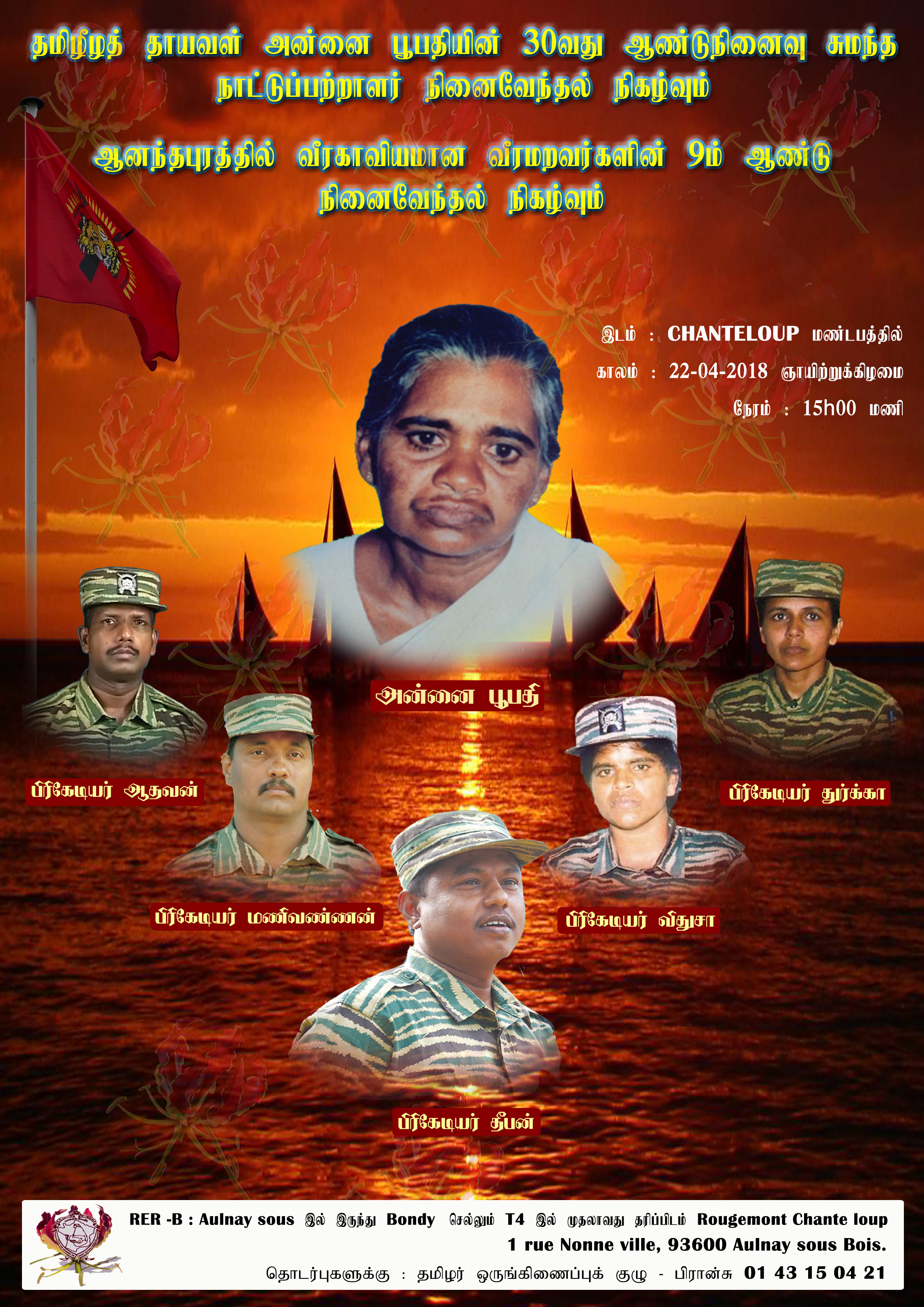 தமிழீழத் தாயவள் அன்னை பூபதியின் 30 வது ஆண்டு நினைவு சுமந்த நாட்டுப்பற்றாளர் நினைவேந்தல் நிகழ்வும், ஆனந்தபுரத்தில் வீரகாவியமான வீரமறவர்களின் 9ம் ஆண்டு நினைவேந்தல் நிகழ்வும் பாரிசின் புறநகர்ப் பகுதியில் ஒன்றாள ஒல்னே சூ புவாவில் எதிர்வரும் 22.04.2018 அன்று இடம் பெற உள்ளது.