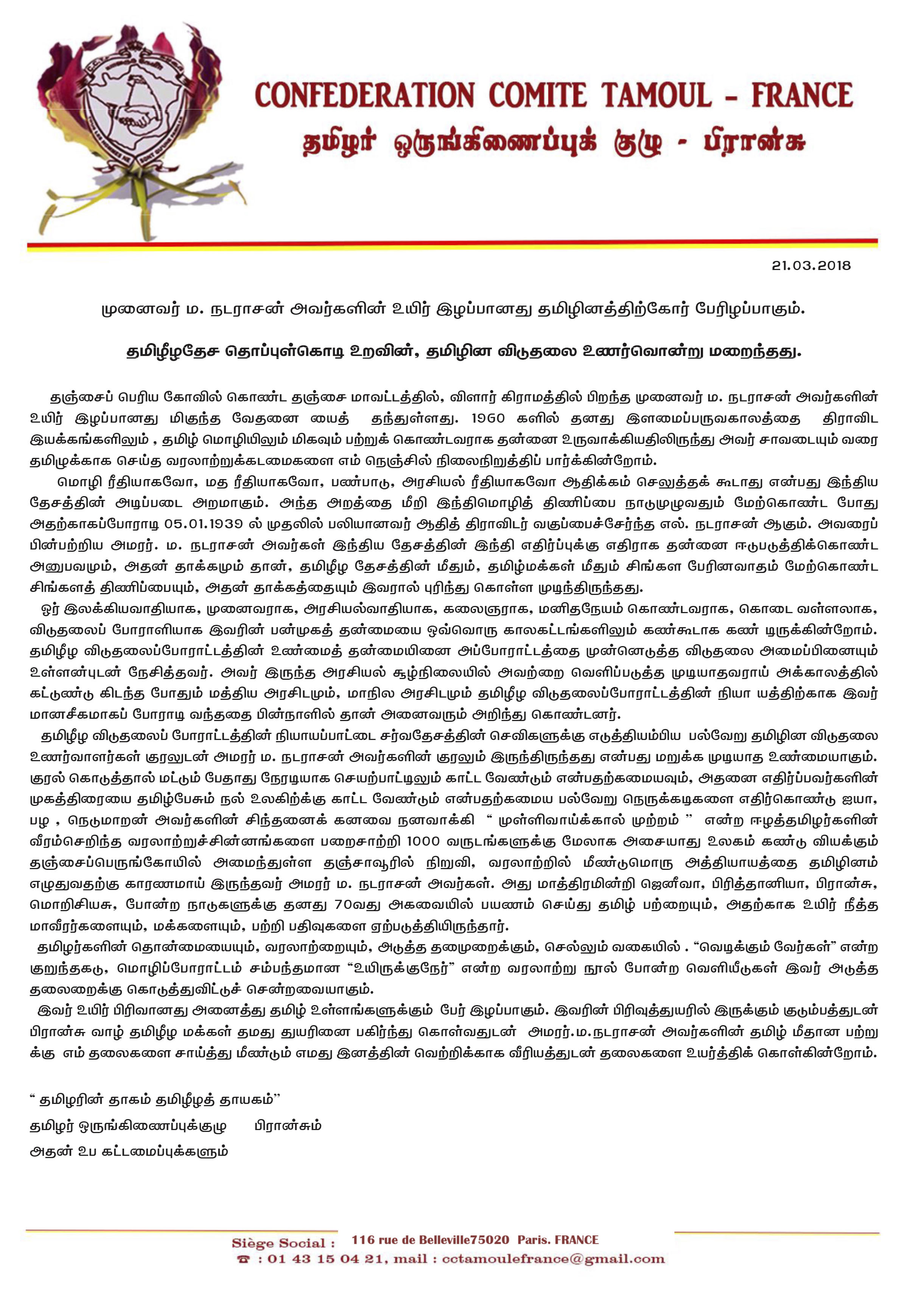 முனைவர் ம.நடராசன் அவர்களின் மறைவு குறித்து தமிழர் ஒருங்கிணைப்புக்குழு பிரான்சும் அதன் உபகட்டமைப்புக்களும் இரங்கல் தெரிவித்து வெளியிட்டுள்ள அறிக்கையில்,