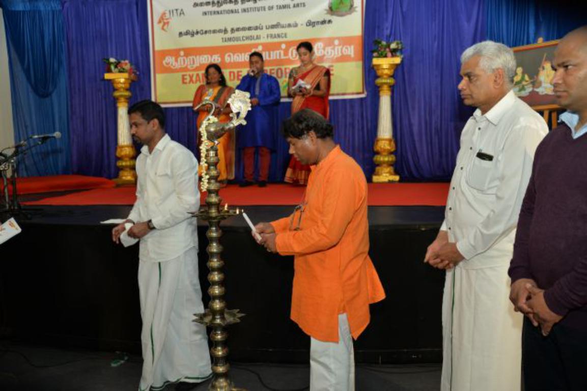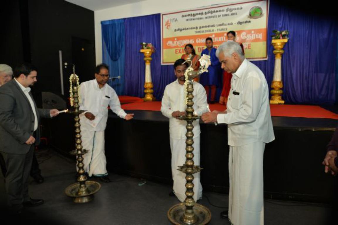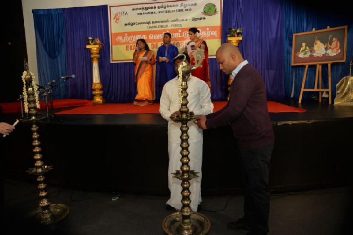 மங்கள விளக்கேற்றினை மாநகரபிதா Mr.Maurice Lefevre அவருடன் உதவி முதல்வர் Mr. Benoit Jimenez அவர்களும், தமிழர் ஒருங்கிணைப்புக் குழு பிரான்சு பொறுப்பாளர் திரு. மகேசு அவர்களும், தமிழ்ச் சோலை தலைமைப் பணியக பொறுப்பாளர் திரு. ஜெயக்குமாரன். மற்றும் தேர்வு நடுவர்களான சங்கீத வித்துவான்களும், சங்கீத பூசணங்களான சுவிசு நாட்டிலிலுந்து திரு. செகசோதி ஆறுமுகம் அவர்கள், டென்மார்க்கில் இருந்து திருமதி. குமுதினி பிரதிவிராஜா அவர்களும், சுவிசு நாட்டிலிருந்து அனைத்துலகத் தமிழ் கலை நிறுவனத்தாலும் வந்தருந்த நடன ஆசிரியர்கள் திருமதி. பவானி சிறீதரன் அவர்களும், திருமதி. ஞானசுந்தரி வாசன் அவர்களும், திருமதி. நிமலினி ஜெயக்குமார் அவர்களும்,வயலின் ஆசிரியர் நுண்கலை மாணி திருமதி. தர்மிகா முரளிதரன் அவர்கள் பிரான்சு ஆகியோர் ஏற்றிவைத்திருந்தனர்.