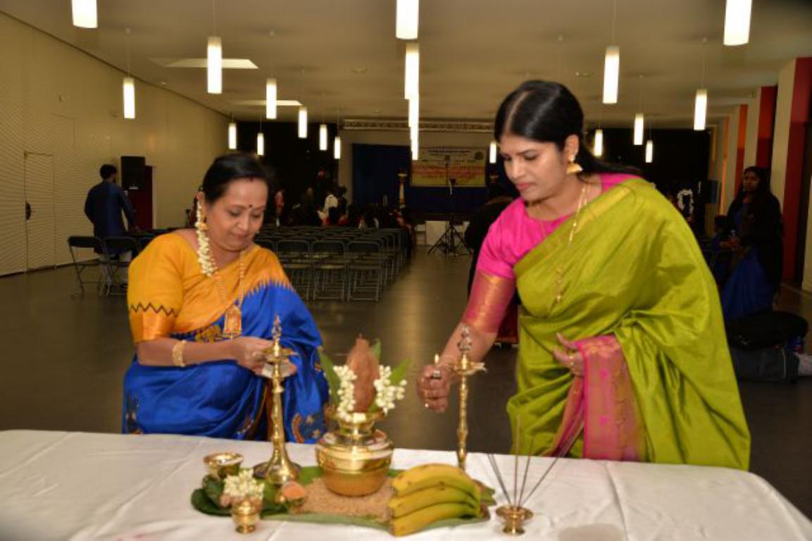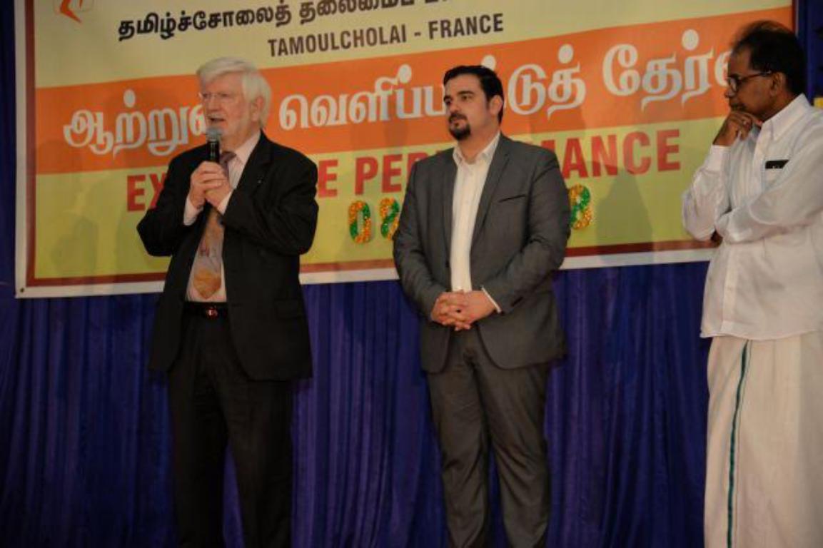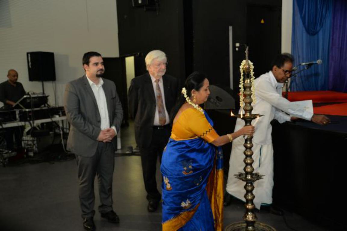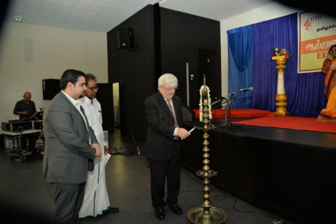 மங்கள விளக்கேற்றினை மாநகரபிதா Mr.Maurice Lefevre அவருடன் உதவி முதல்வர் Mr. Benoit Jimenez அவர்களும், தமிழர் ஒருங்கிணைப்புக் குழு பிரான்சு பொறுப்பாளர் திரு. மகேசு அவர்களும், தமிழ்ச் சோலை தலைமைப் பணியக பொறுப்பாளர் திரு. ஜெயக்குமாரன். மற்றும் தேர்வு நடுவர்களான சங்கீத வித்துவான்களும், சங்கீத பூசணங்களான சுவிசு நாட்டிலிலுந்து திரு. செகசோதி ஆறுமுகம் அவர்கள், டென்மார்க்கில் இருந்து திருமதி. குமுதினி பிரதிவிராஜா அவர்களும், சுவிசு நாட்டிலிருந்து அனைத்துலகத் தமிழ் கலை நிறுவனத்தாலும் வந்தருந்த நடன ஆசிரியர்கள் திருமதி. பவானி சிறீதரன் அவர்களும், திருமதி. ஞானசுந்தரி வாசன் அவர்களும், திருமதி. நிமலினி ஜெயக்குமார் அவர்களும்,வயலின் ஆசிரியர் நுண்கலை மாணி திருமதி. தர்மிகா முரளிதரன் அவர்கள் பிரான்சு ஆகியோர் ஏற்றிவைத்திருந்தனர்.