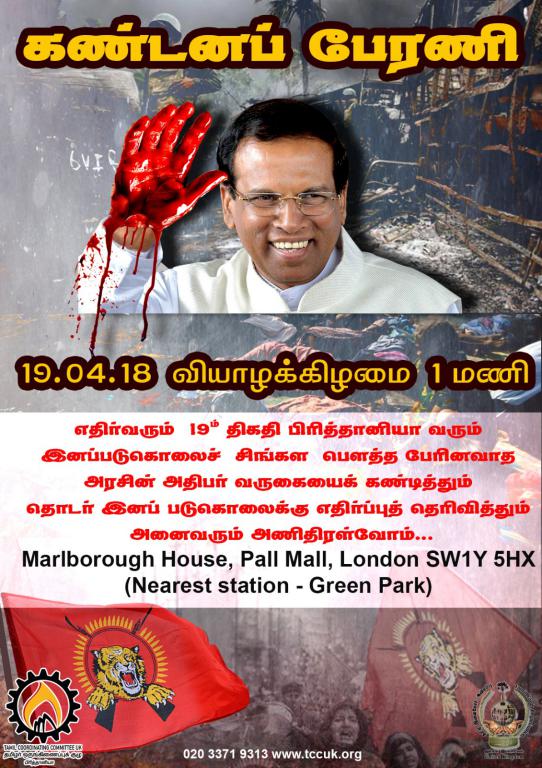 சிறப்பு செய்திகள்புலத்துச்செய்திகள் பிரிதானிவரும் மைத்திரிக்கு எதிராக கண்டனப் பேரணி! By Admin - April 18, 2018 0 186 நாளை (19) பிரித்தானியாவிற்கு வருகைதரவிருக்கும் சிறீலங்கா இனப்படுகொலை அரசின் அதிபர் மைத்திரிக்கு எதிரான கண்டனப்பேரணி பகல் 13.00 மணிக்கு இடம் பெற உள்ளது.