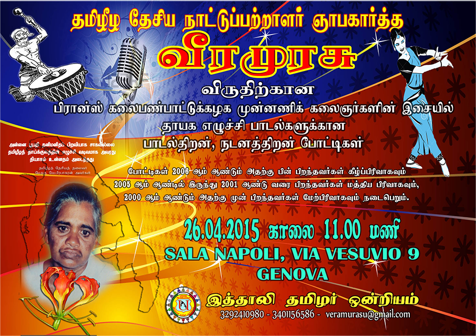 புலத்துச்செய்திகள் இத்தாலியில் நாட்டுப்பற்றாளர் ஞாபகார்த்த வீரமுரசு பாடல் திறன், நடனத்திறன் போட்டி நிகழ்ச்சி! By Admin - March 16, 2015 0 463