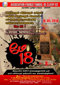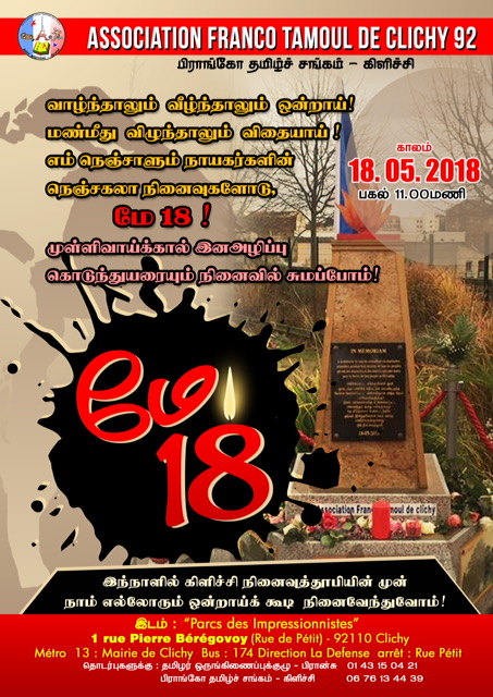 சிறப்பு செய்திகள்புலத்துச்செய்திகள் முள்ளிவாய்க்கால் இனவழிப்பு கொடுந்துயரை நினைவில் சுமப்போம்.! By Admin - May 8, 2018 0 597 மே 18 முள்ளிவாய்க்கால் தமிழினப் படுகொலையின் வலிசுமந்த 9 வது ஆண்டு நினைவேந்தல் தினத்தில் பரிசின் புறநகர்ப் பகுதியில் ஒன்றான கிளிச்சிப் பகுதியில் அமைந்துள்ள நினைவுத்தூபியின் முன் 15.05.2018 அன்று காலை 11.00 மணிக்கு ஒன்று கூடல் நிகழ்வு இடம் பெற உள்ளது.