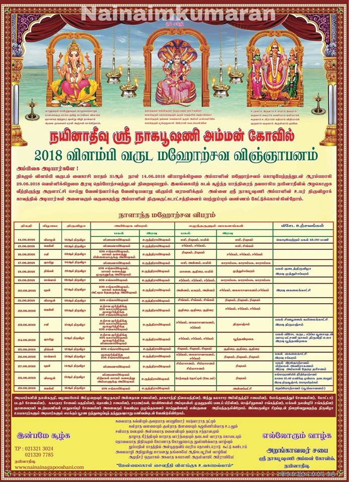 வரலாற்றுச் சிறப்புமிகு நயினாதீவு அருள்மிகு ஶ்ரீ நாகபூசணி அம்பாள் ஆலய விளம்பி வருட உயர் திருவிழா 2018 இன்று (14.06.2018) வியாழக்கிழமை கொடியேற்றத்துடன் ஆரம்பமாகியது.