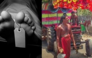 தூக்குக் காவடி எடுத்த உழவு இயந்திரத்தின் பெட்டியில் சிறுவனும் மற்றும் பலரும் சென்றுள்ளனர்.
