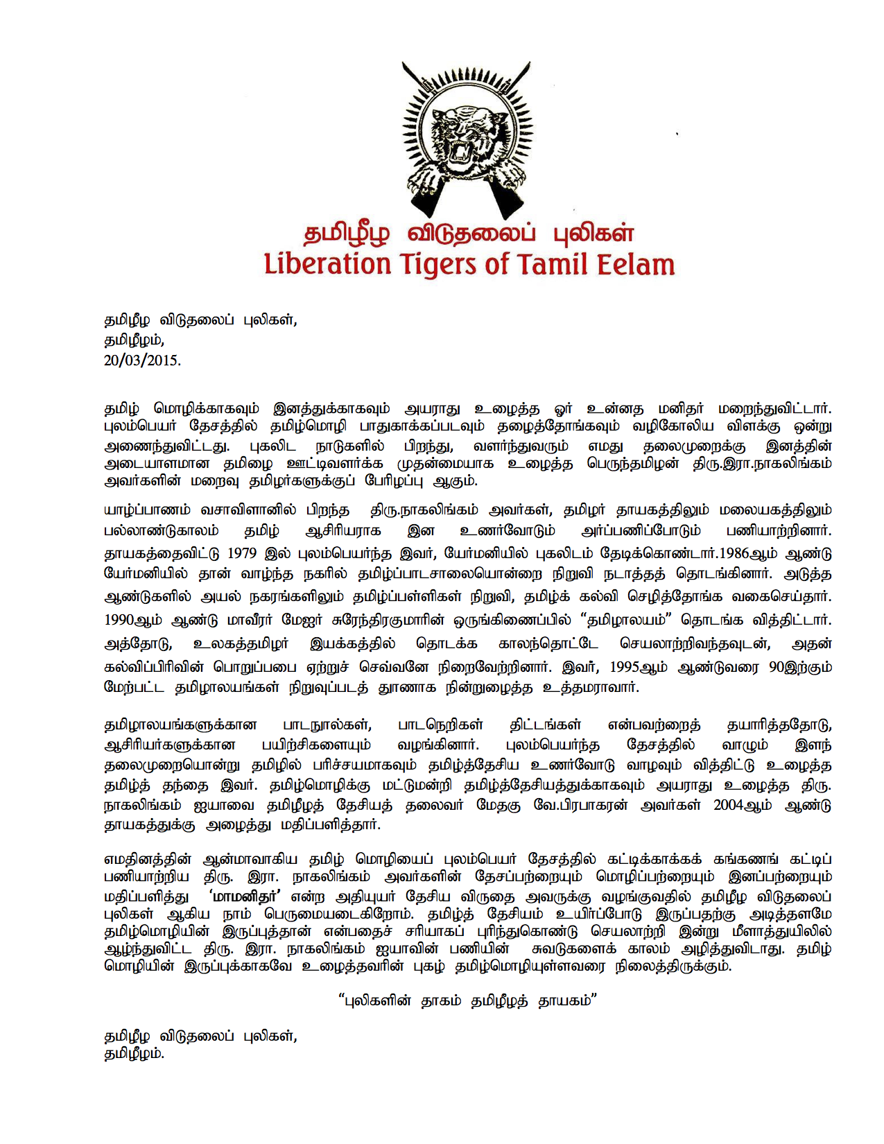 தேசப்பற்று மற்றும் மொழிப்பற்றுக்காக இரா.நாகலிங்கம் ஐயா ”மாமனிதராக” தமிழீழ விடுதலைப் புலிகளால் மதிப்பளிப்பட்டுள்ளார். இதுகுறித்து தமிழீழ விடுதலைப் புலிகள் விடுத்துள்ள அறிக்கை வருமாறு:-