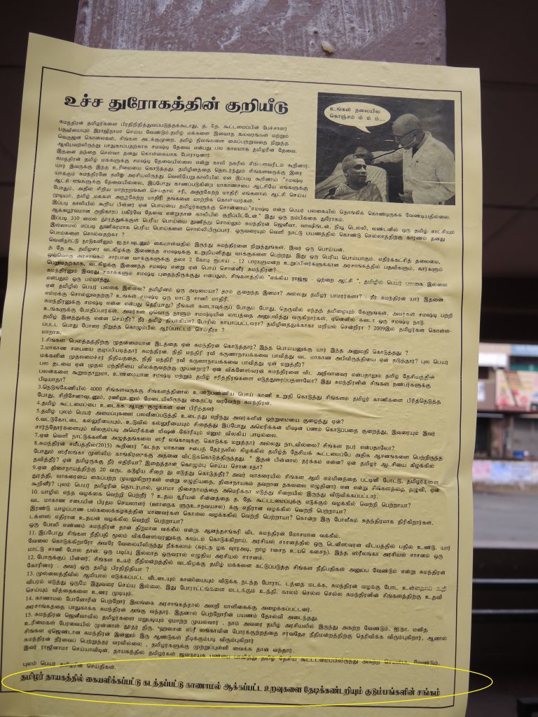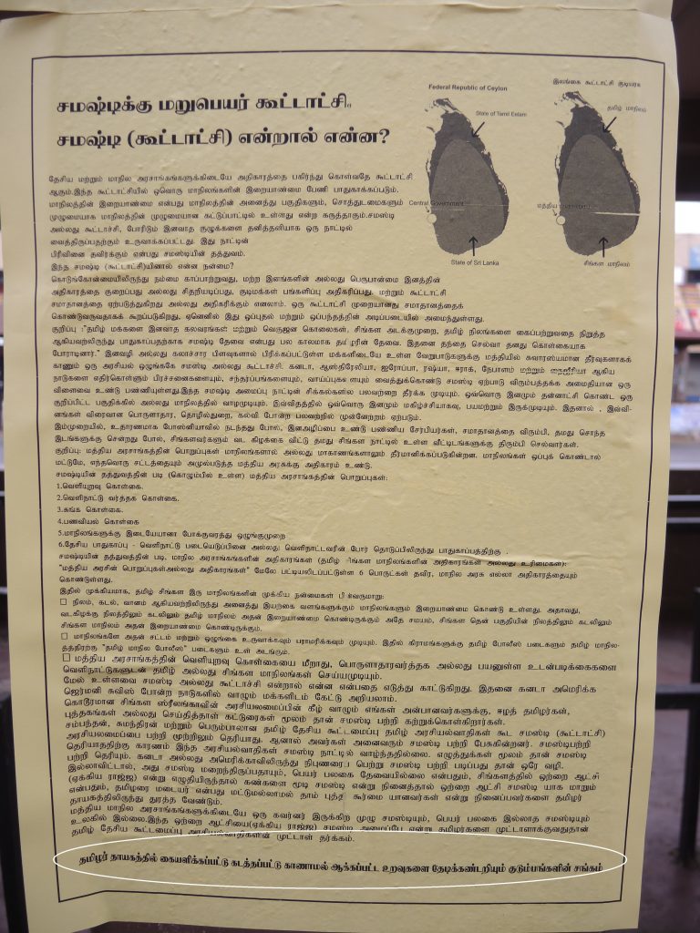 என்று தலைப்பிடப்பட்டு பல்வேறு விடயங்களை குறிப்பிட்டதுடன் இறுதியில் ஒற்றை ஆட்சியை (ஏக்கிய ராஜ்ஜ) சமஷ்டி அமைப்பே என்று தமிழர்களை முட்டாளாக்குவதுதான் தமிழ்த்தேசிய கூட்டமைப்பின் அரசியல்வாதிகளின் முட்டாள் தர்க்கம் என்று பிரசுரிக்கப்பட்டுள்ளதுடன் இவ்விரண்டு சுவரொட்டிகளுக்கும் தமிழர் தயாகத்தில் கையளிக்கப்பட்டு கடத்தப்பட்டு காணாமல் ஆக்கப்பட்ட உறவுகளைத்தேடிக் கண்டறியும் குடும்பங்களின் சங்கம் உரிமை கோரியுள்ளமை குறிப்பிடத்தக்கது.
