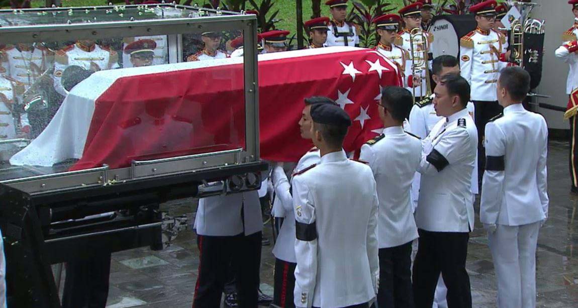 லீயின் உடலானது சிவப்பு வெள்ளை நிறம் கொண்ட சிங்கப்பூர் கொடியால் மூடப்பட்டு பாராளுமன்ற வளாகத்தில் இருந்து இராணுவ மரியாதையுடன் கொண்டு செல்லப்பட்டது.