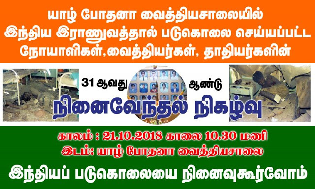 தமிழர் தாயகத்தில் தனது கோர முகத்தைக் காட்டிக்கொண்டிருந்த இந்தியப் படையினர், கடந்த 1987 ஆம் ஆண்டு ஒக்ரோபர் மாதம் 21 ஆம் திகதி யாழ். போதனா வைத்தியசாலைக்குள் புகுந்து கண்ணில் பட்டவர்களை எல்லாம் சுட்டுக் படுகொலை செய்தனர்.