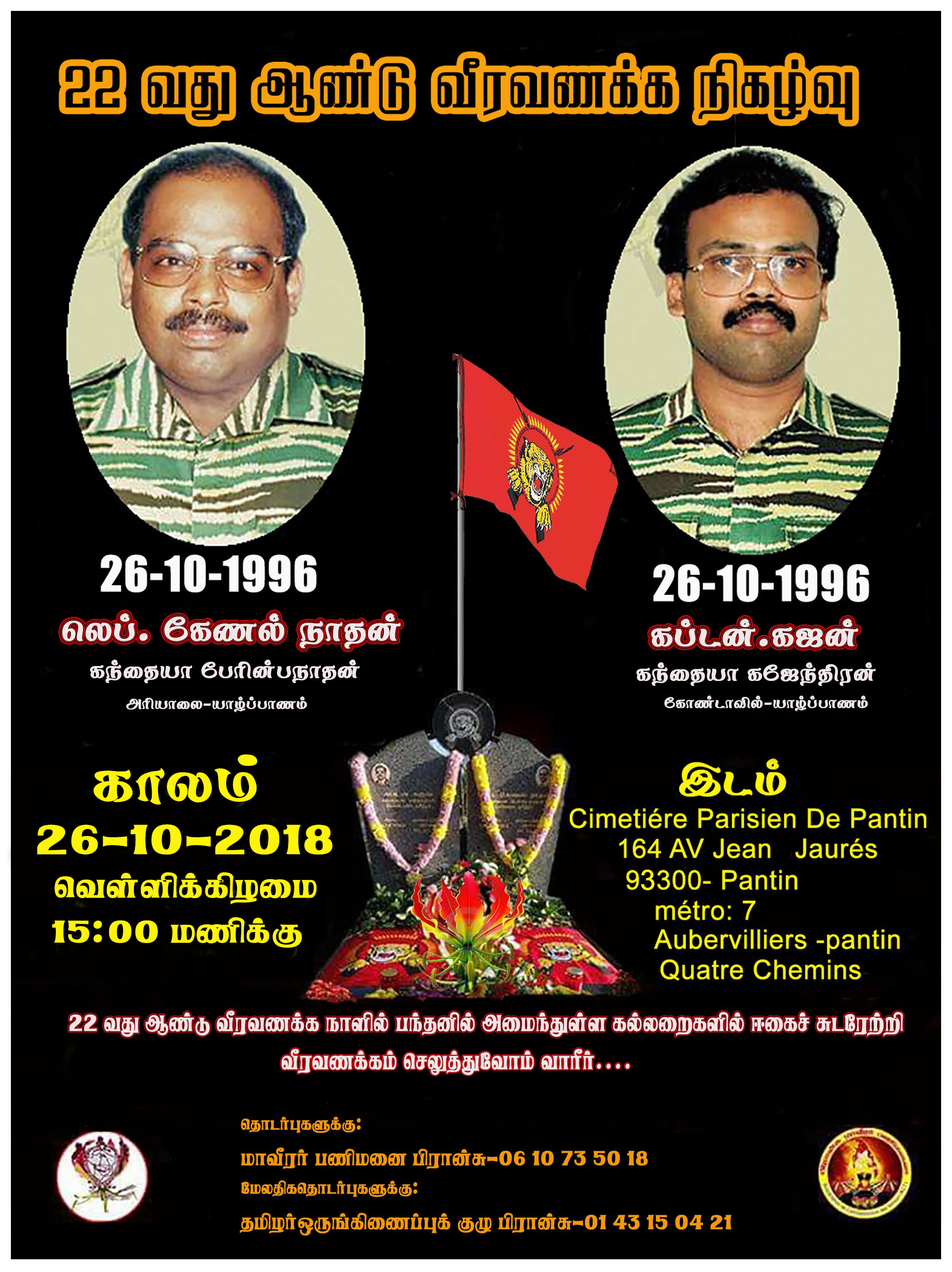 தாயக விடுதலைக்காக புலம்பெயர் நாடுகளில் பணிபுரிந்த வேளை 26.10.1996 அன்று பிரான்ஸ் தலைநகர் பரிசில் வைத்து சிறிலங்கா அரச கைக்கூலிகளின் தாக்குதலில் வீரச்சாவைத் தழுவிக் கொண்ட தமிழீழ விடுதலைப்புலிகளின் அனைத்துலக நிதிப்பொறுப்பாளர் லெப்.கேணல் நாதன் மற்றும் ஊடகப்போராளியும் ஈழமுரசின் நிறுவக ஆசிரியருமான கப்டன் கஜன் ஆகியோரின் 22ஆம் ஆண்டு வீரவணக்க நாள் இன்றாகும்.