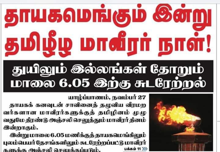 ஈழச்செய்திகள்சிறப்பு செய்திகள் தாயகம் எங்கும் மாவீரர் நாள்! – ஊடகங்களில் தலைப்பு! By Admin - November 27, 2018 0 355 இன்று தாயகம் மற்றும் புலம்பெயர் தேசம் எங்கும் தமிழீழ தேசிய மாவீரர் நாள் நினைவு கொள்ளப்படுகிறது. அதுகுறித்தே ஊடகங்களில் தலைப்பிடப்பட்டுள்ளது.