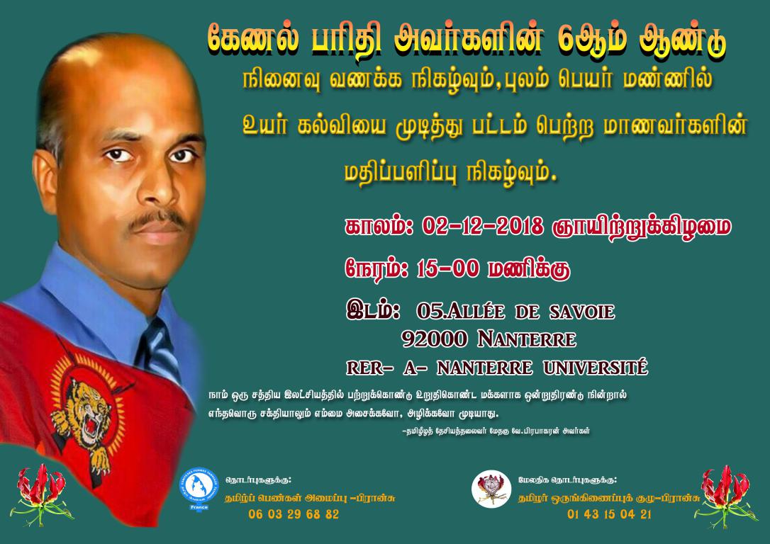தமிழர் ஒருங்கிணைப்புக்குழு பிரான்சு தமிழ்ப் பெண்கள் அமைப்பு நடாத்தும், கேணல் பரிதி அவர்களின் 6 ஆம் ஆண்டு நினைவு வணக்க நிகழ்வும் உயர்கல்வியை முடித்து பட்டம் பெற்ற மாணவர்களின் மதிப்பளித்தல் நிகழ்வும் எதிவரும் 02.12.2018 ஞாயிற்றுக்கிழமை 15.00 மணிக்கு நந்தயரில் நடைபெற உள்ளது.