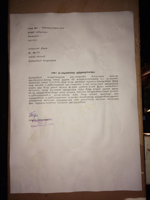 திருநெல்வேலி பொது சந்தையில் நடைபாதைக்கு இடையூறாக ஒரு வியாபாரி நடந்து கொண்டார் என்பதற்காக அவருடைய வியாபார உரிமத்தை தற்காலிகமாக தடுத்துள்ள நல்லூர் பிரதேசபை, அவர் மீது விசாரணை ஒன்றினையும் மேற்கொண்டுள்ளது.
