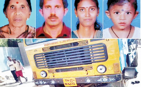 சென்னை பல்லாவரத்தில் தண்ணீர் லாரி தறிகெட்டு ஓடியதில் ஏற்பட்ட விபத்தில் மோட்டார் சைக்கிளில் சென்ற ஒரே குடும்பத்தைச் சேர்ந்த 4 பேரும், அடையாளம் தெரியாத இளைஞர் ஒருவரும் உயிரிழந்தனர்.
