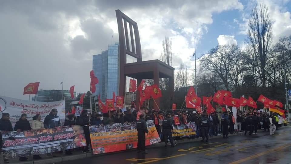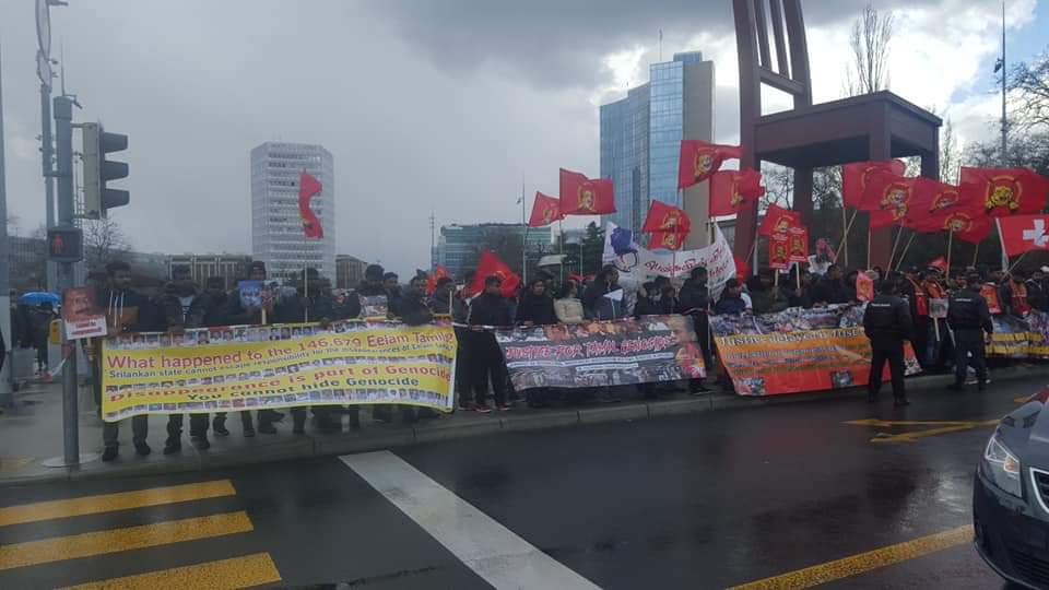தமிழின அழிப்பிற்கு இனிமேலும் தாமதிக்காது நீதியை பெற்றுக்கொடுக்க சர்வதேச சமூகம் முன்வர வேண்டும் என்று வலியுறுத்தி- ஜெனீவாவிலுள்ள ஐ.நா தலைமையகத்திற்கு முன்பாக புலம்பெயர் தமிழர்கள் இன்று 04.03.2019 திங்கட்கிழமை அணியெனத் திரண்டு கவனயீர்ப்புப் போராட்டமொன்றை நடத்தினர்.