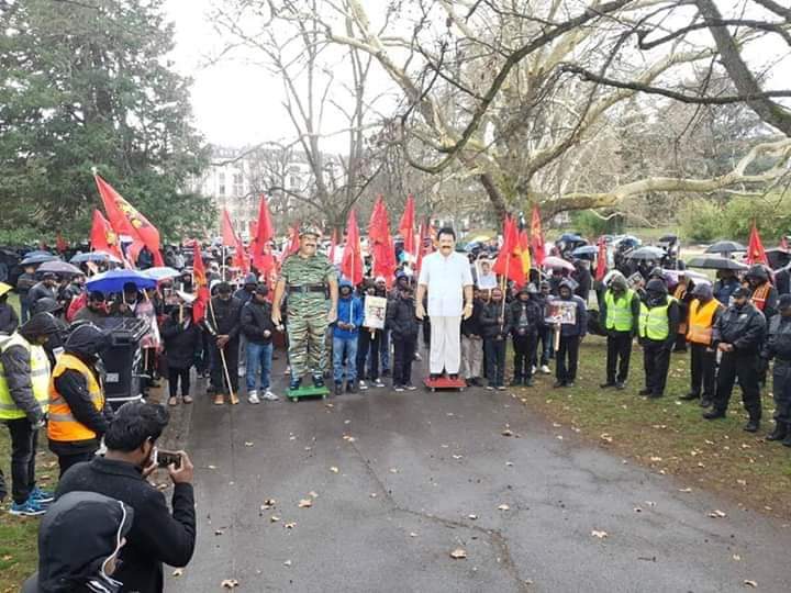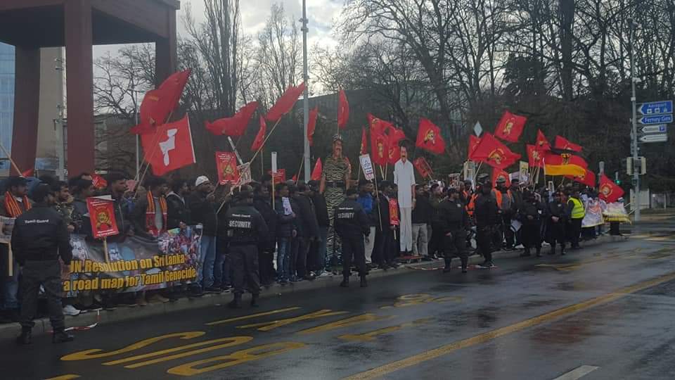 சுவிஸர்லாந்தின் ஜெனீவா நகரிலுள்ள புகையிரத நிலையத்திற்கு அருகாமையிலுள்ள பூங்காவில் திரண்ட புலம்பெயர் தமிழர்கள், அங்கிருந்து ஐ.நா தலைமையகம் வரையான கண்டனப் பேரணியை இன்று பிற்பகல் 2.00 மணிக்கு ஆரம்பித்தனர். இதில் குழந்தைகள், சிறுவர்கள்,பெண்கள், வயோதிபர்கள் என அனைத்து வயதினரும்கலந்து கொண்டிருந்ததுடன், தமிழ் மக்களுக்கு நீதி கோரி பல கோசங்களையும் எழுப்பினர்.