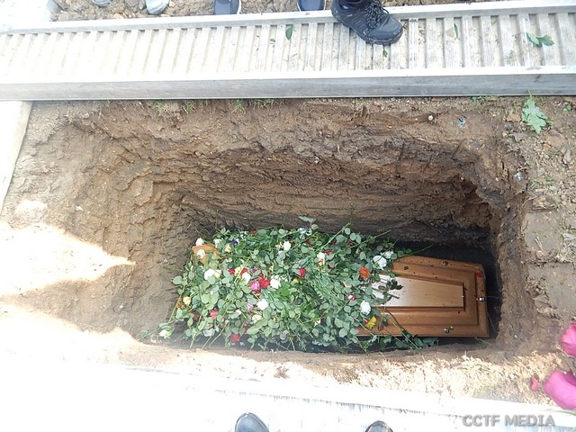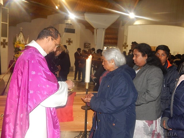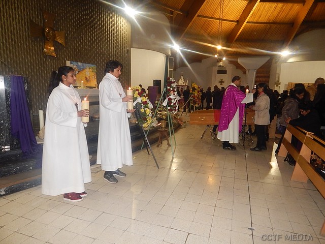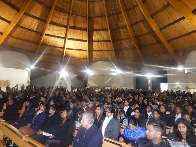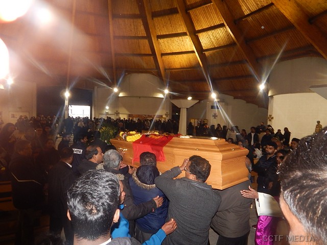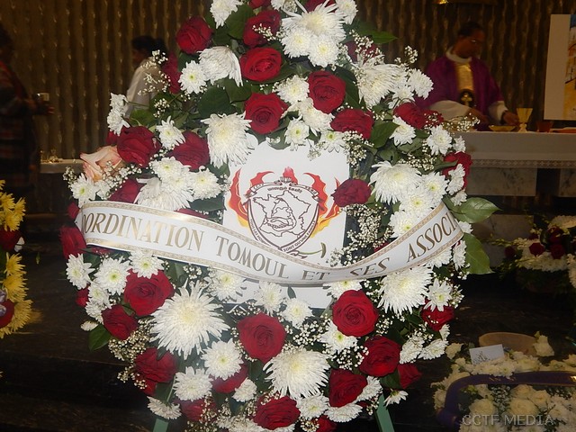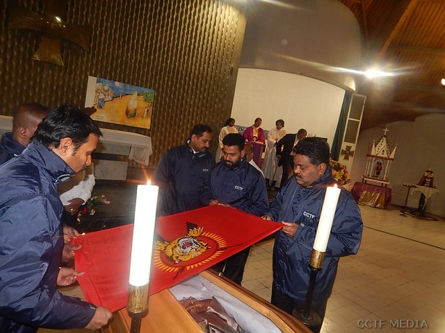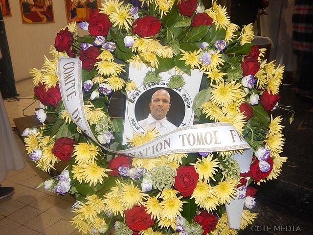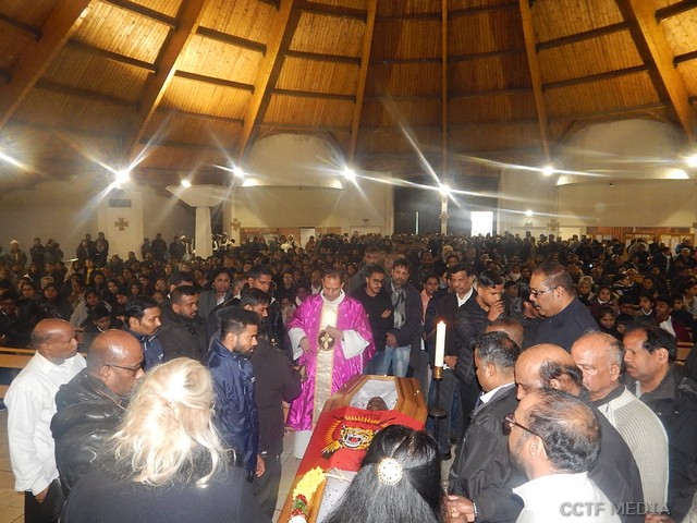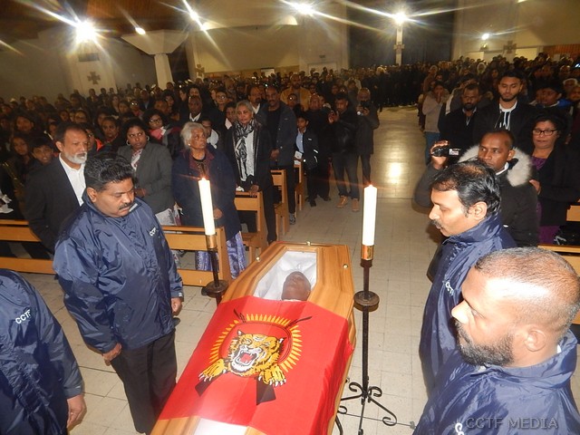 காலை 10.00 மணிக்கு Grigny பகுதியில் உள்ள தேவாலயத்தில் திருப்பலி ஒபபுக்கொடுக்கப்பட்டு, அங்கு வித்துடலுக்கு பிரான்சு தமிழர் ஒருங்கிணைப்புக்குழுவினால் தமிழீழத் தேசியக்கொடி போர்த்தப்பட்டு மதிப்பளிக்கப்பட்டது. தொடர்ந்து நினைவுரைகளும் இடம்பெற்றன. இதனைத்தொடர்ந்து திருப்பலியில் கலந்துகொண்ட அனைவரும் அணிவகுத்து வித்துடலுக்கு அஞ்சலி செலுத்தியதைத் தொடர்ந்து, வித்துடல் இறுதி நிகழ்விற்காக பிரான்சு தமிழ்ச்சோலை பள்ளி மாணவர்களின் கொட்டொலி வாத்திய அணிவகுப்புடன் துயிலுமில்லத்திற்கு எடுத்துச்செல்லப்பட்டு, அங்கு மதச் சடங்குகள் இடம்பெற்றன.
