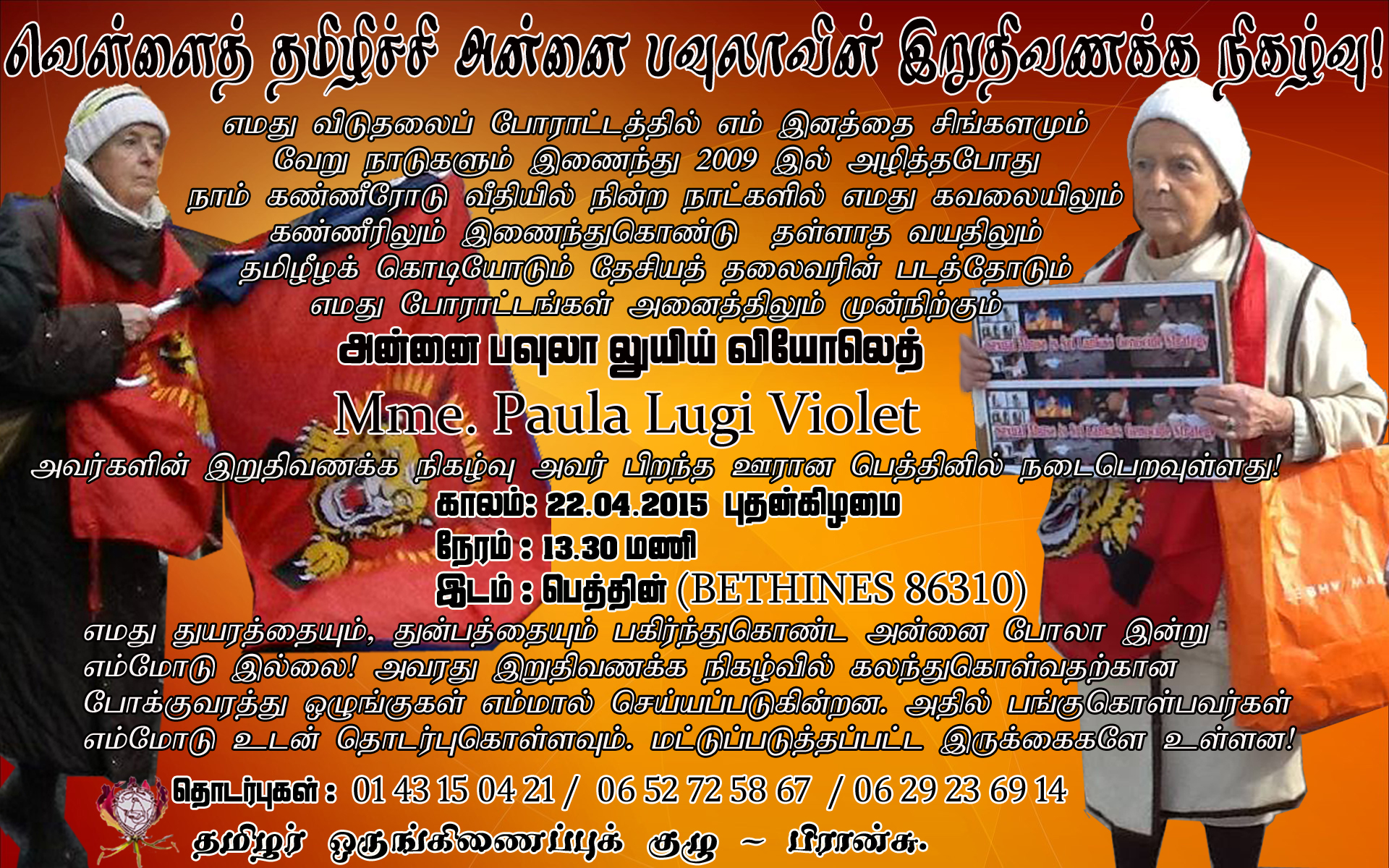 எமது விடுதலைப்போராட்டத்தில் எமது இனத்தை சிங்களமும், வேறு நாடுகளும் இணைந்து 2009 இல் அழித்தபோது நாம் கண்ணீரும், கவலையாகவும் வீதியில் நின்ற நாட்களில் எமது கவலையிலும், கண்ணீரிலும் இணைந்து கொண்டு தள்ளாத வயதிலும் தமிழீழக் கொடியோடும், தேசியத்தலைவரின் படத்தோடும் எமது போராட்டங்கள் அனைத்திலும் முன் நிற்கும் அன்னை போலாவின் இறுதி நிகழ்வு அவரின் பிறந்த கிராமத்தில் நடைபெறவுள்ளது