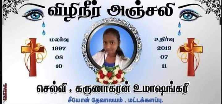 கடந்த ஏப்ரல் 21 சியோன் தேவாலய isis பயங்கரவாதத் தாக்குதலுக்கு உட்பட்டு வைத்திய சாலையில் அனுமதிக்கப்பட்டிருந்த மட்டக்களப்பு மாவட்டத்தைச் சேர்ந்த கிழக்கு பல்கலைக்கழக கலை கலாச்சார பீட முதலாம் ஆண்டு மாணவி கருணாகரன் உமாசங்கரி சிகிச்சை பலனின்றி இன்று (11.07.2019) வியாழக்கிழமை கொழும்பு வைத்தியசாலையில் மரணமடைந்துள்ளார்.
