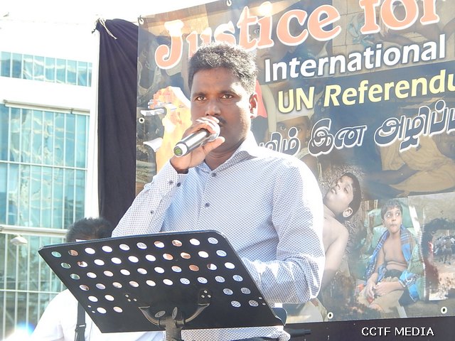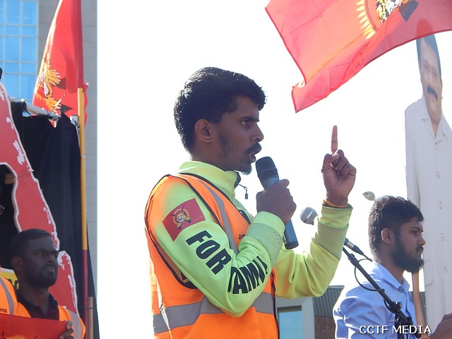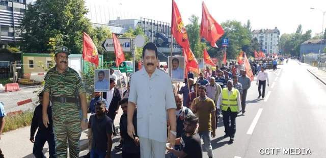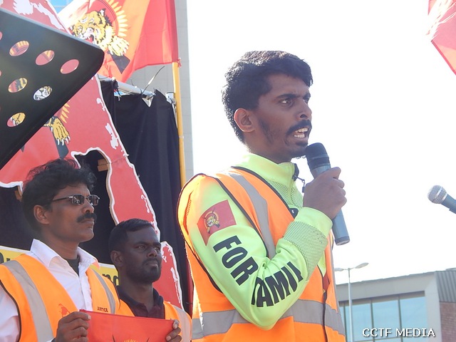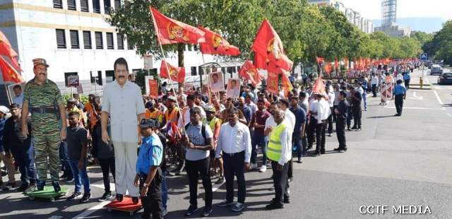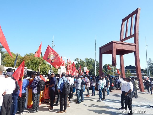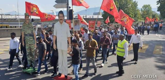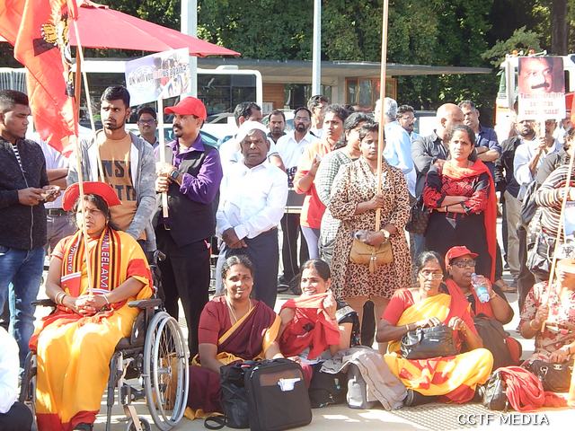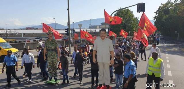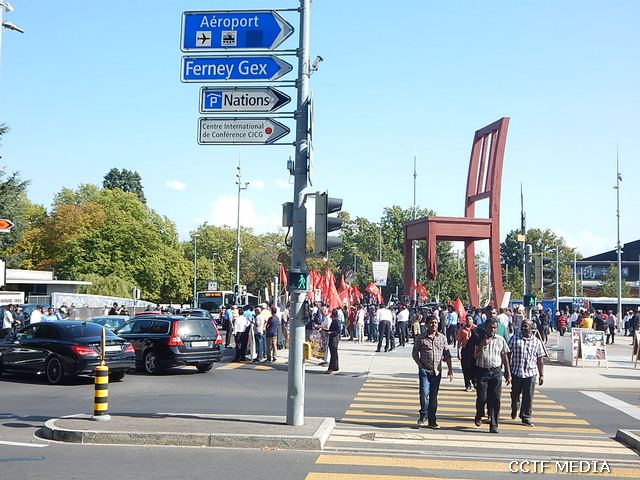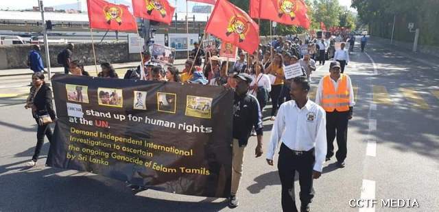 இந்தக் கவனயீர்ப்புப் போராட்டத்திற்கு முன்னதாக ஜெனீவா தொடருந்து நிலையத்திற்கு அருகாமையிலுள்ள பூங்காவில் இருந்து ஐ.நா. வரையில் கண்டனப் பேரணி முன்னெடுக்கப்பட்டது.