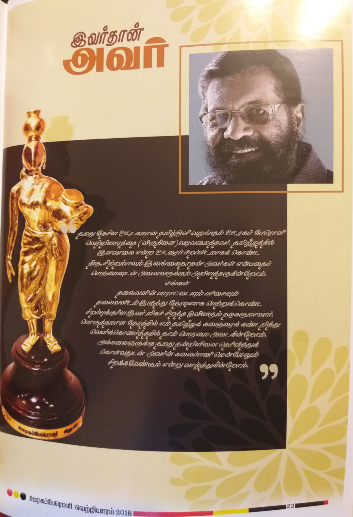 2018 ஆம் ஆண்டு பிரான்சில் ரிரிஎன் தமிழ் ஒளித் தொலைக் காட்சியின் கிராமிய நடனப்போட்டியான ஊரகப்பேரொளி விருதினை வடிவமைத்துக் கொடுத்துள்ள பெருமையும் இவரையே சாரும். இவ்வாறான பல பெருமைகளுக்கு உரித்தான ஒரு பெரும் பன்முகக் கலைஞனை இந்த தமிழ்த் தேசிய சமூகம் இன்று இழந்துள்ளது. இவரது இழப்பானது இவரது குடும்பத்தினருக்கு மட்டுமல்லாமல் தமிழ்த் தேசியப் பரப்பில் இட்டுநிரப்பப்படமுடியாத ஒன்றாகவே பார்க்கப்படுகின்றது. – கந்தரதன்.